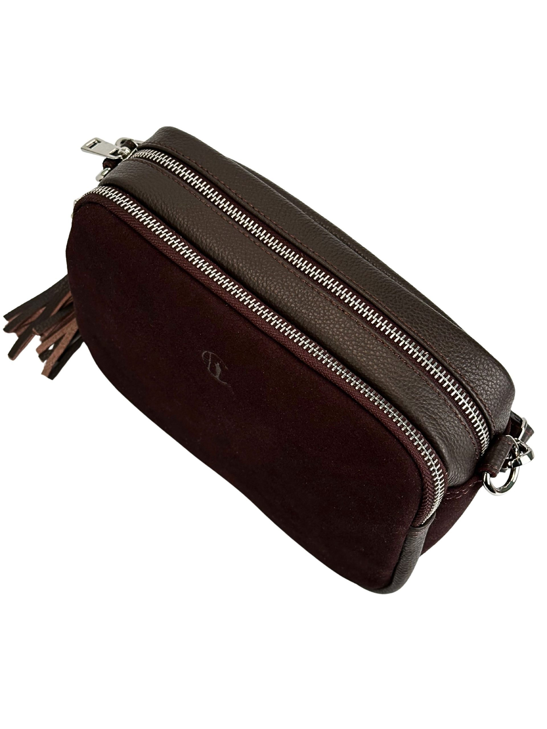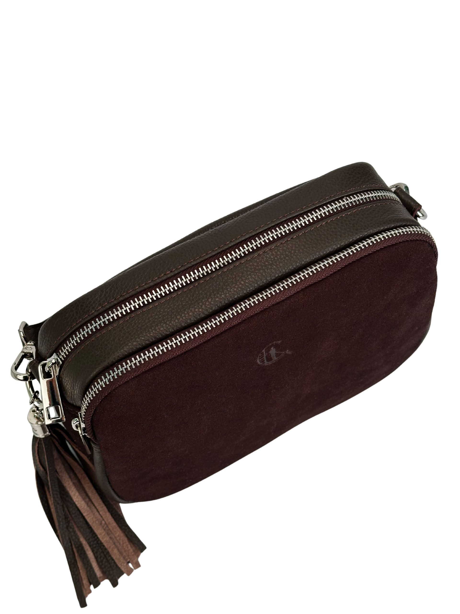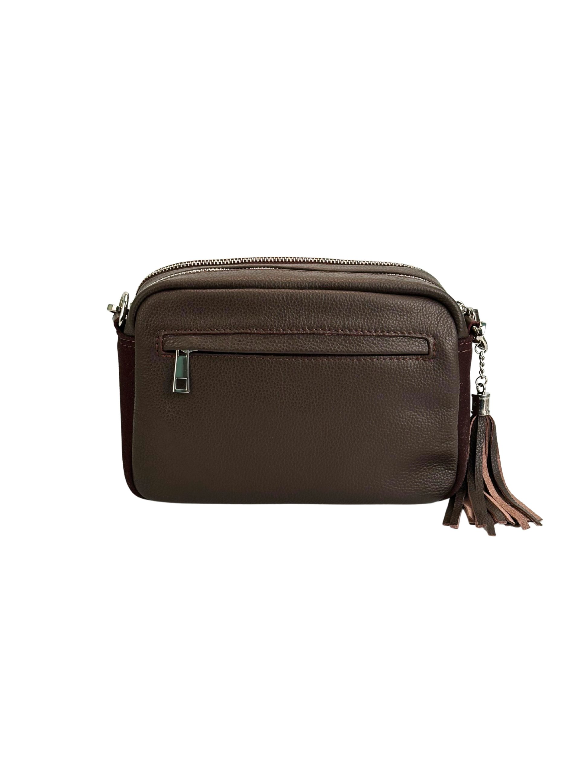 Elegancka, wytworna torebka damska wykonana z najwyższej jakości skóry naturalnej w głębokim, czekoladowym odcieniu. Model zachwyca szlachetnym połączeniem dwóch faktur – przód torebki zdobi miękki, luksusowy zamsz, natomiast tył wykonano z gładkiej skóry licowej, co nadaje całości wyjątkowego charakteru i ponadczasowej elegancji.