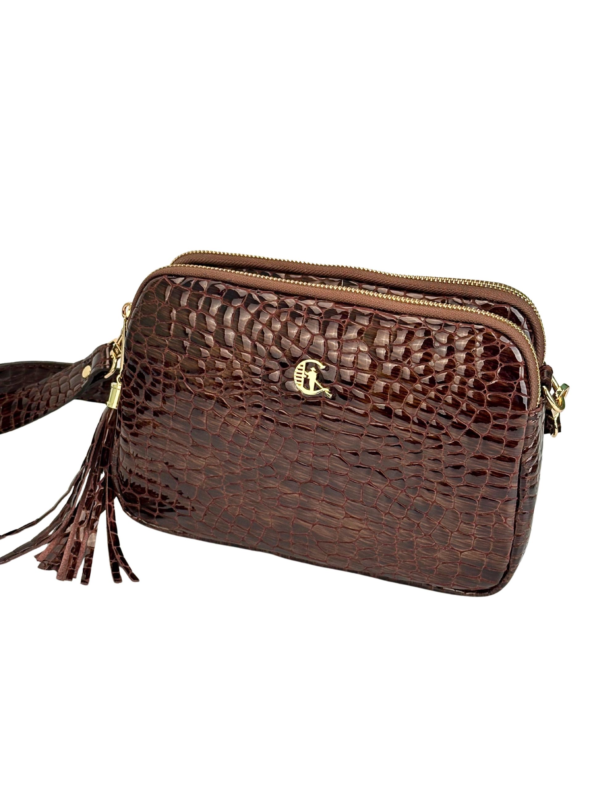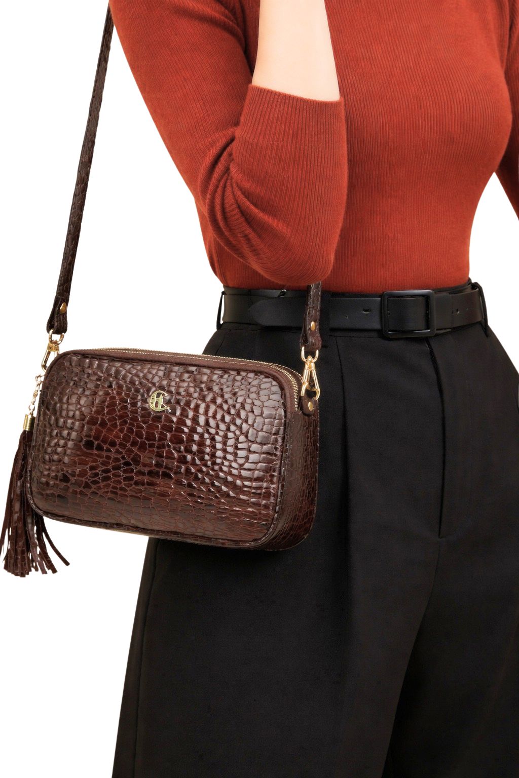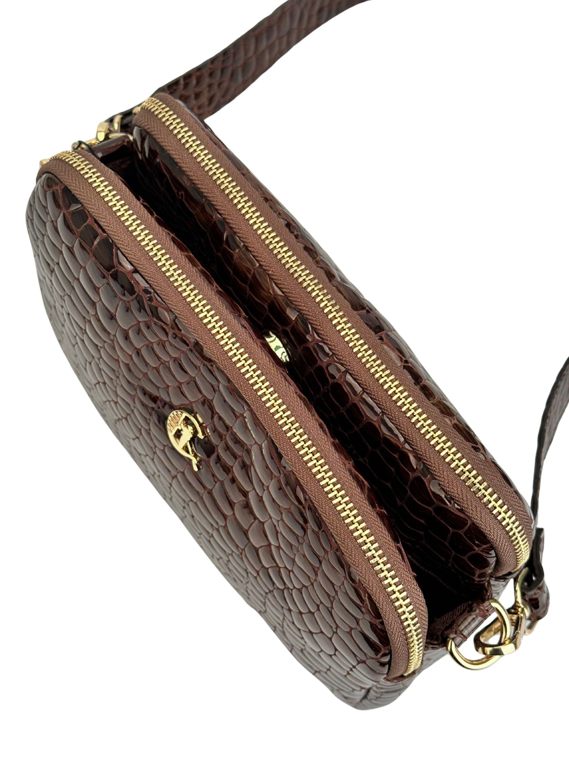 Elegancka torebka damska wykonana z naturalnej skóry o efektownym tłoczeniu typu krokodyl w połyskującym, czekoladowym odcieniu. Model zachwyca ponadczasowym stylem oraz starannym wykończeniem, podkreślając luksusowy charakter dodatku.