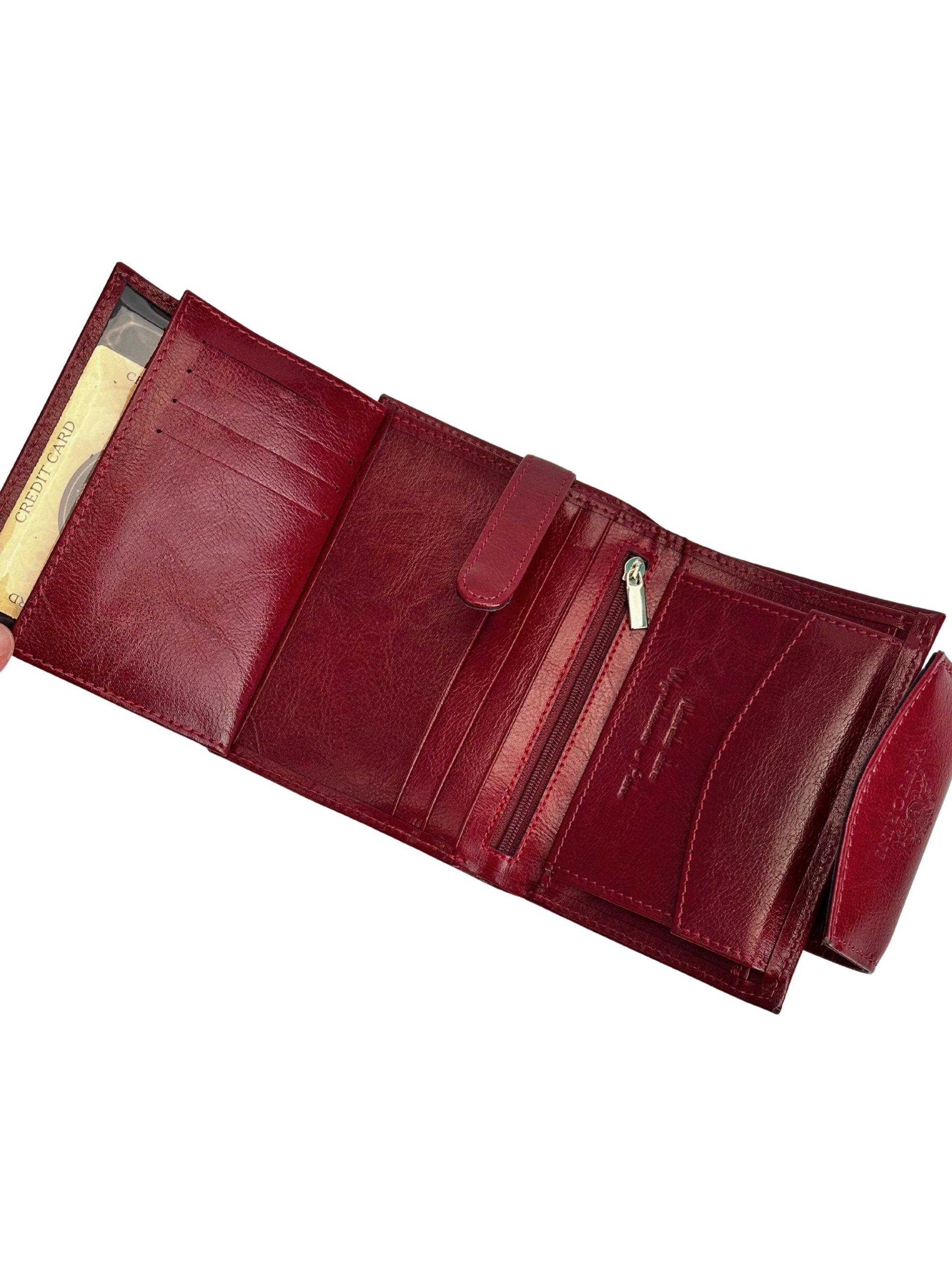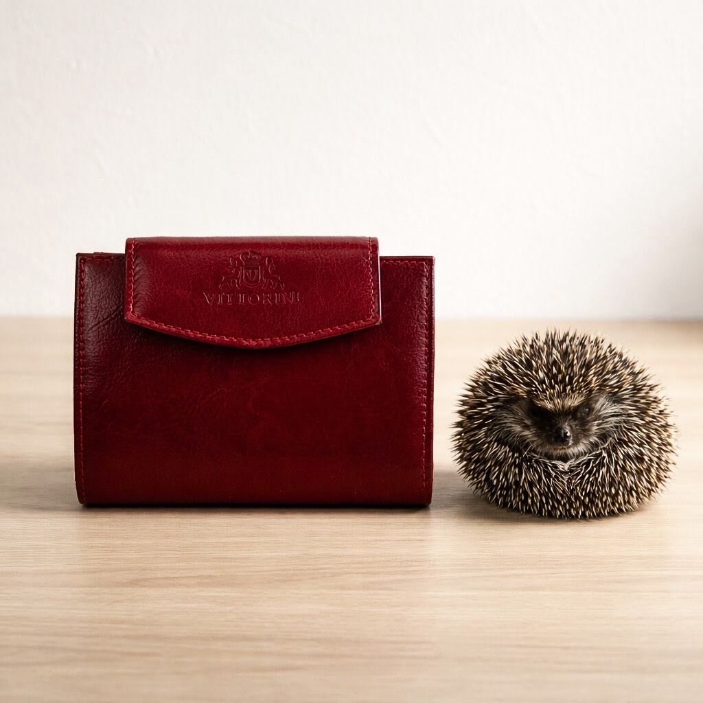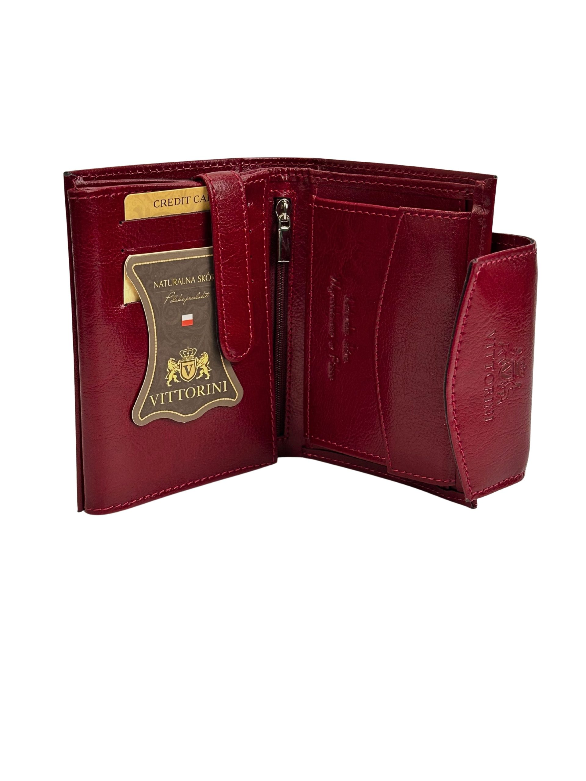 Skórzany portfel damski w głębokim bordo, pochodzący z kolekcji Vittorini, która charakteryzuje się klasycznym designem i najwyższą jakością wykonania. Model został wykonany z naturalnej skóry, co czyni go miękkim i przyjemnym w dotyku. Jest on trwały, dzięki zastosowaniu solidnych i mocnych przeszyć.