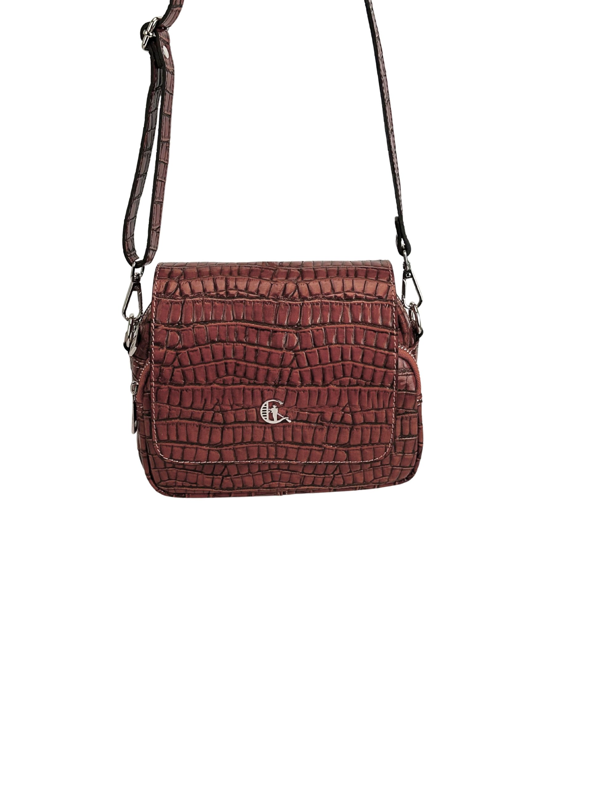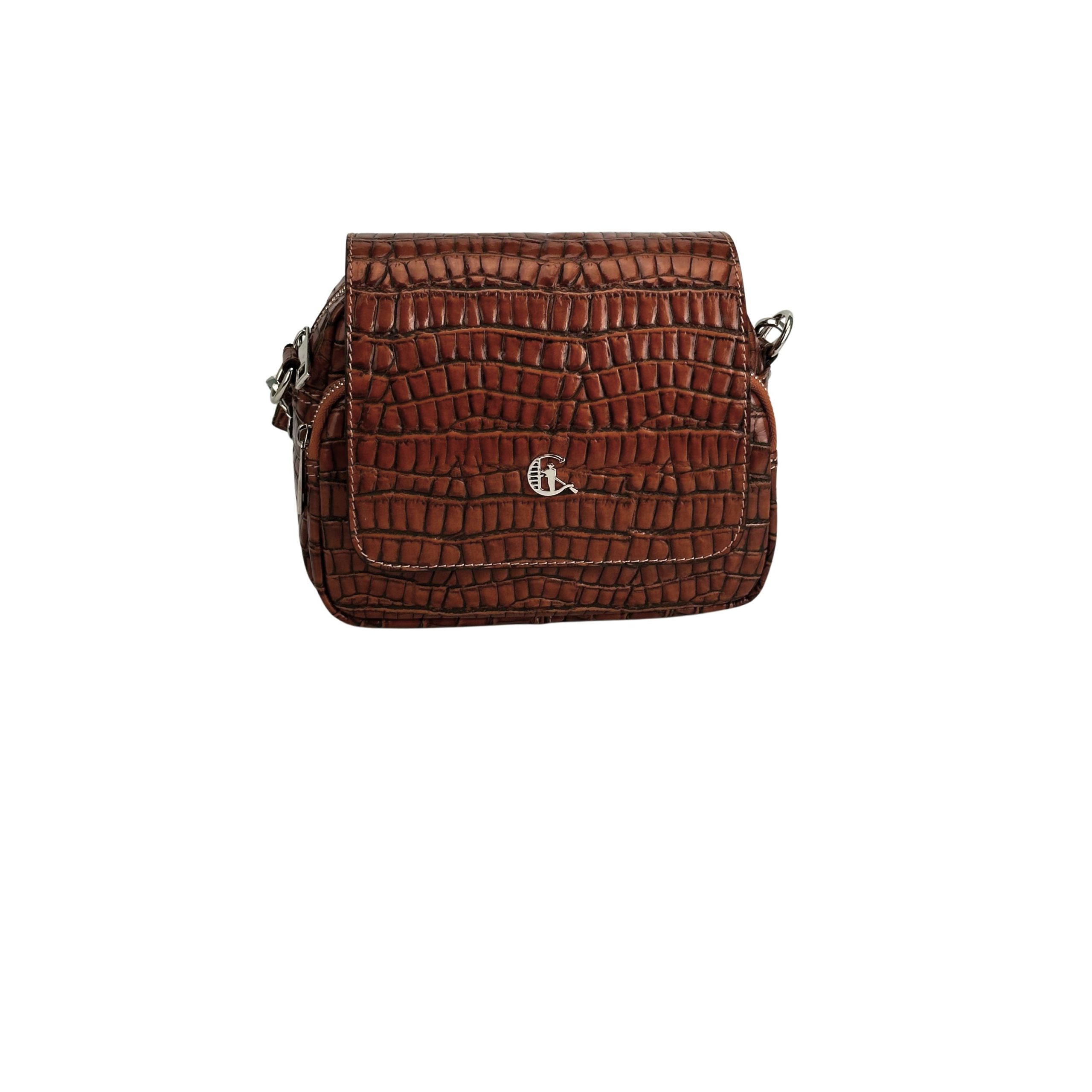 Elegancka torebka wykonana z naturalnej skóry o efektownym tłoczeniu typu krokodyl w połyskującym, jasnobrązowym odcieniu. Model zachwyca ponadczasowym stylem oraz starannym wykończeniem, podkreślając luksusowy charakter dodatku.