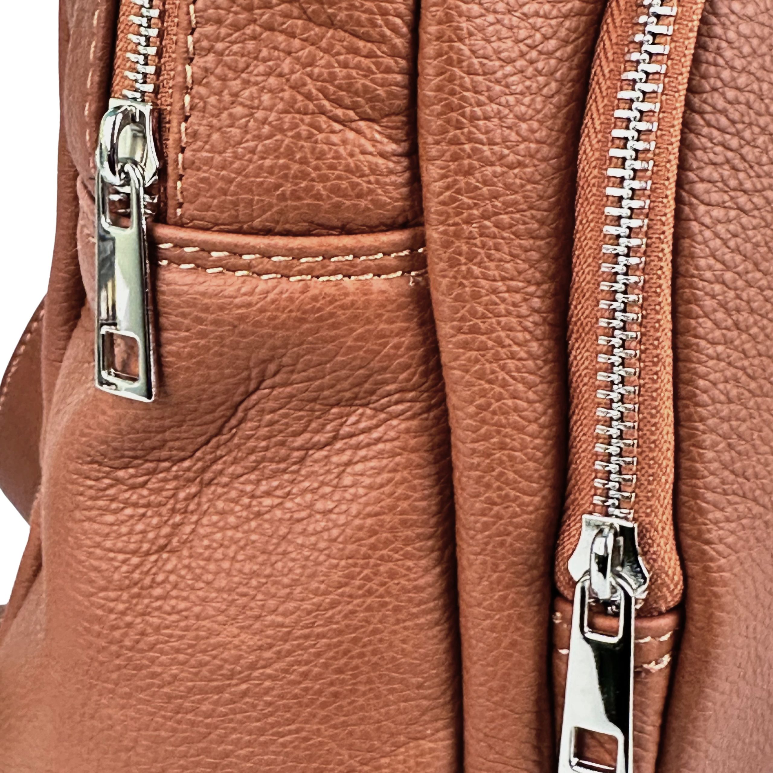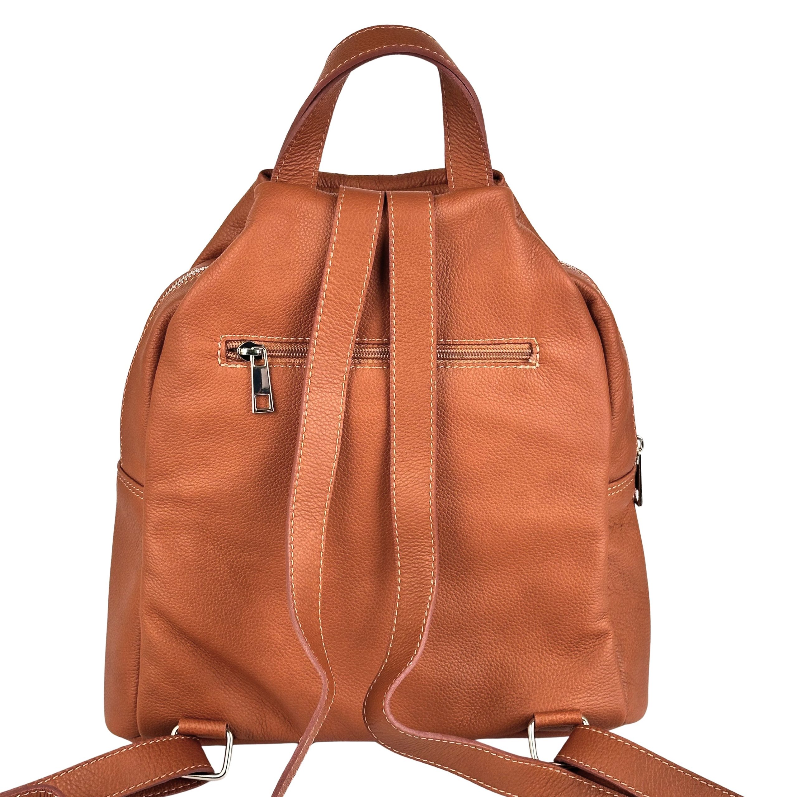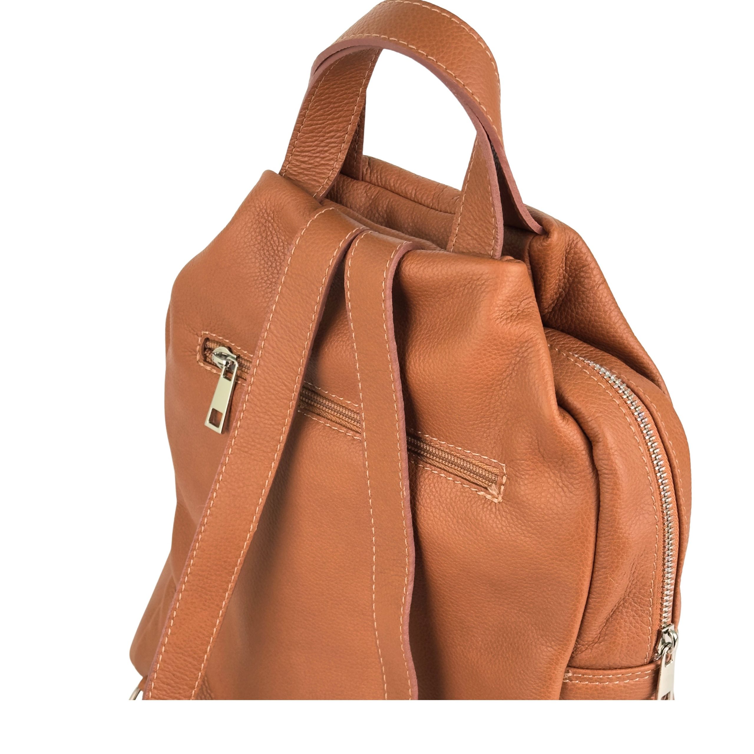 Postaw na luksusowy minimalizm i funkcjonalność. Ten elegancki plecak wykonany z najwyższej jakości naturalnej skóry o strukturze groszkowej to propozycja dla kobiet, które szukają stylowej alternatywy dla klasycznej torebki. Głęboki, ciepły kolor koniakowy sprawia, że plecak doskonale komponuje się zarówno z wełnianym płaszczem, jak i letnią sukienką.
