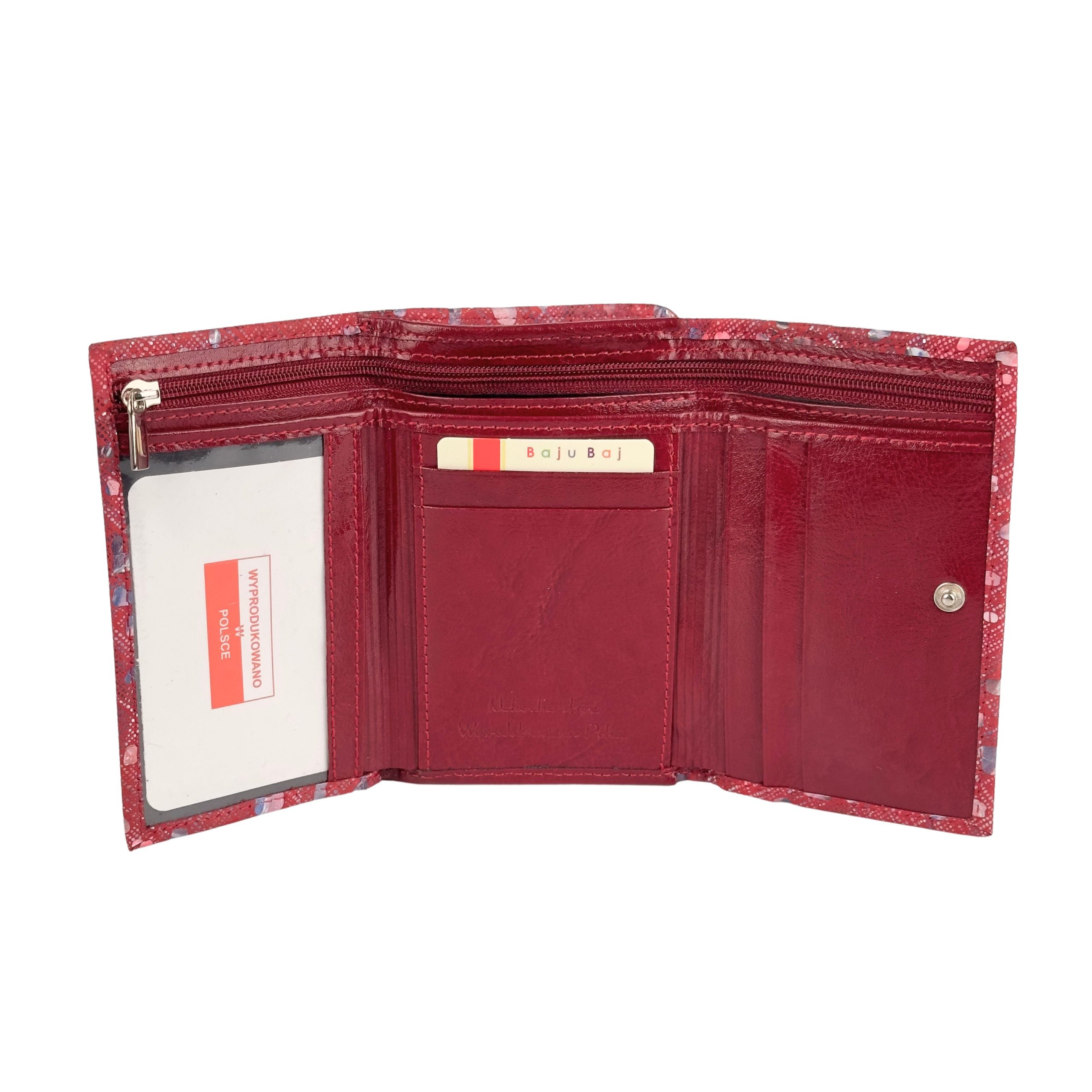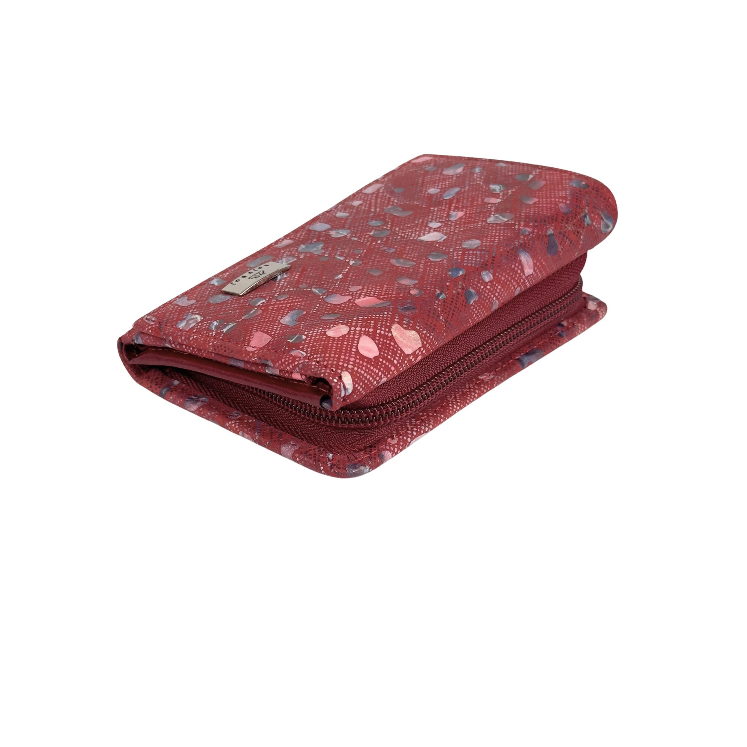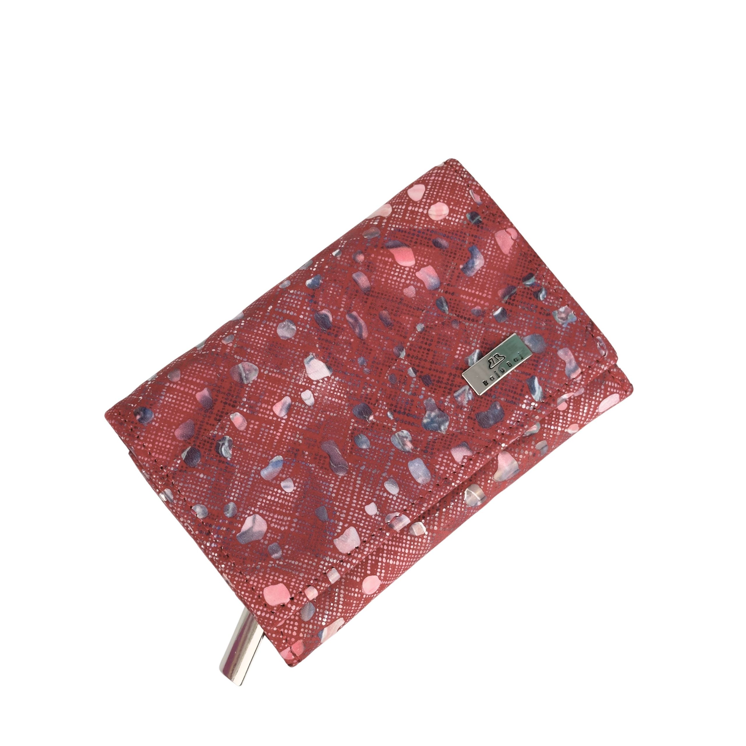 Ten kompaktowy portfel to propozycja dla kobiet, które szukają akcesorium z charakterem. Wykonany z wysokiej jakości skóry naturalnej, zachwyca głęboką, burgundową barwą oraz artystycznym wzorem przypominającym barwną mozaikę lub strukturę egzotyczną. To idealne połączenie luksusowego wykończenia z codzienną praktycznością.