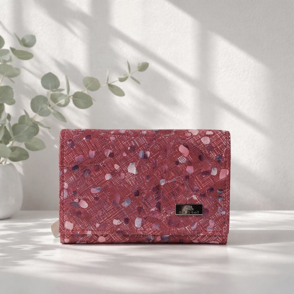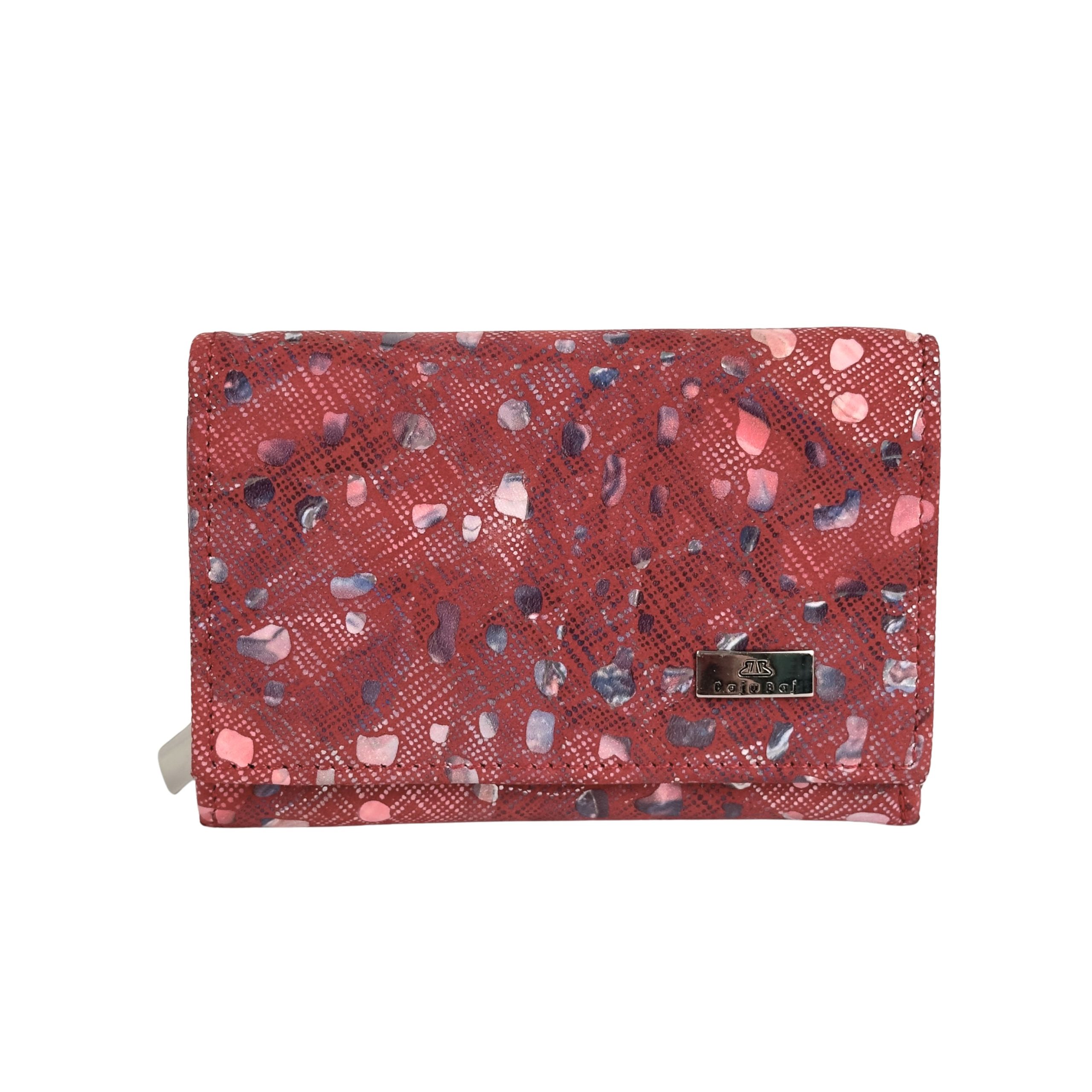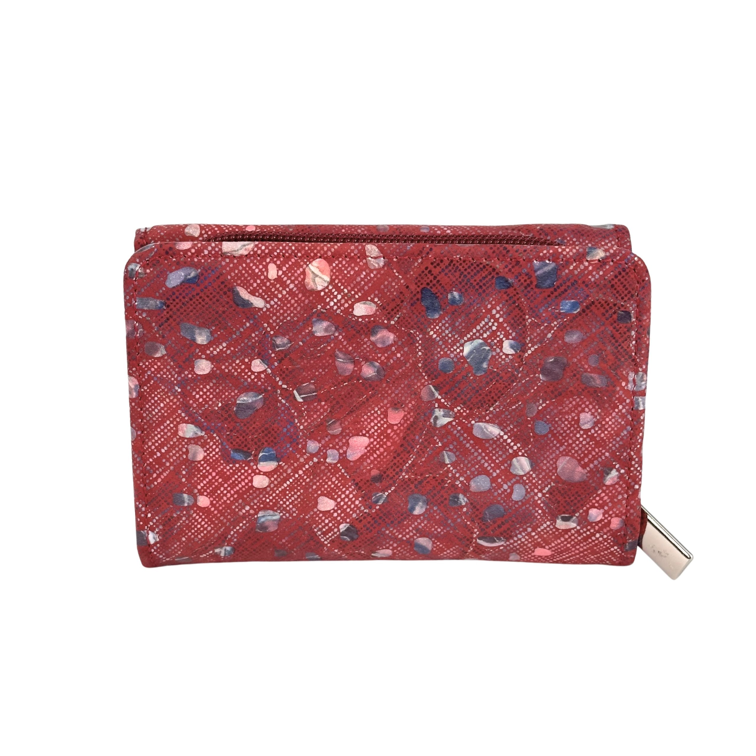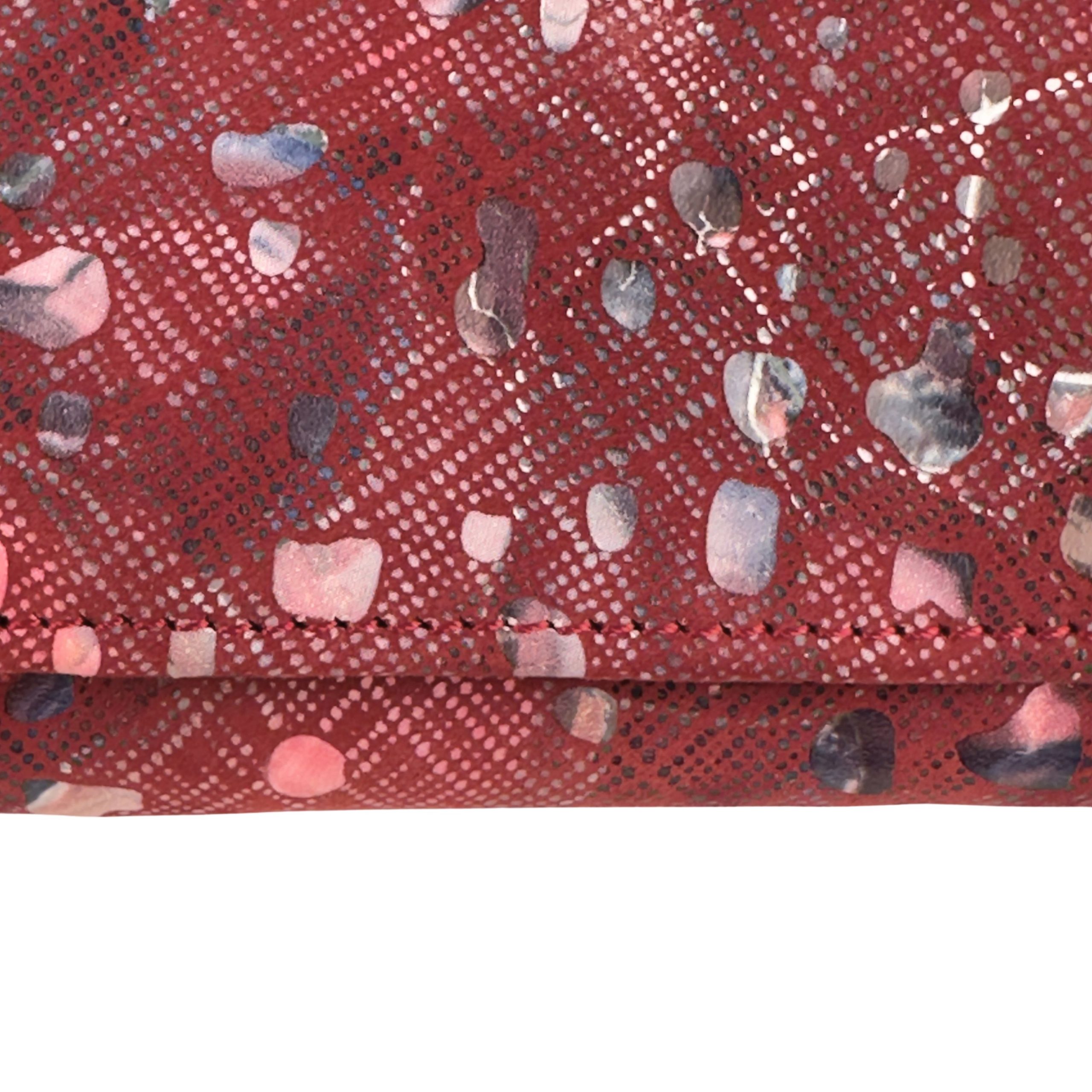 Ten kompaktowy portfel to propozycja dla kobiet, które szukają akcesorium z charakterem. Wykonany z wysokiej jakości skóry naturalnej, zachwyca głęboką, burgundową barwą oraz artystycznym wzorem przypominającym barwną mozaikę lub strukturę egzotyczną. To idealne połączenie luksusowego wykończenia z codzienną praktycznością.