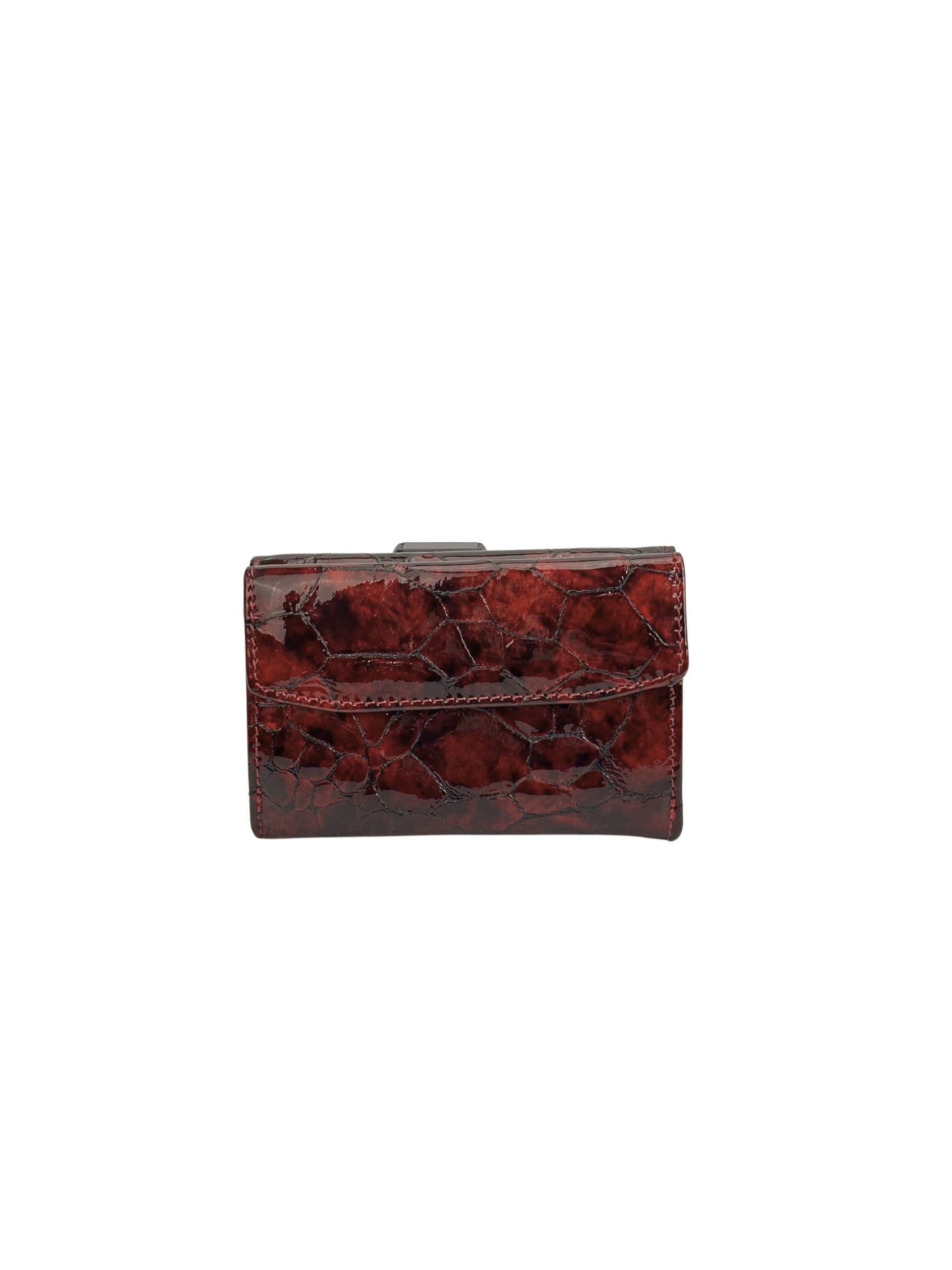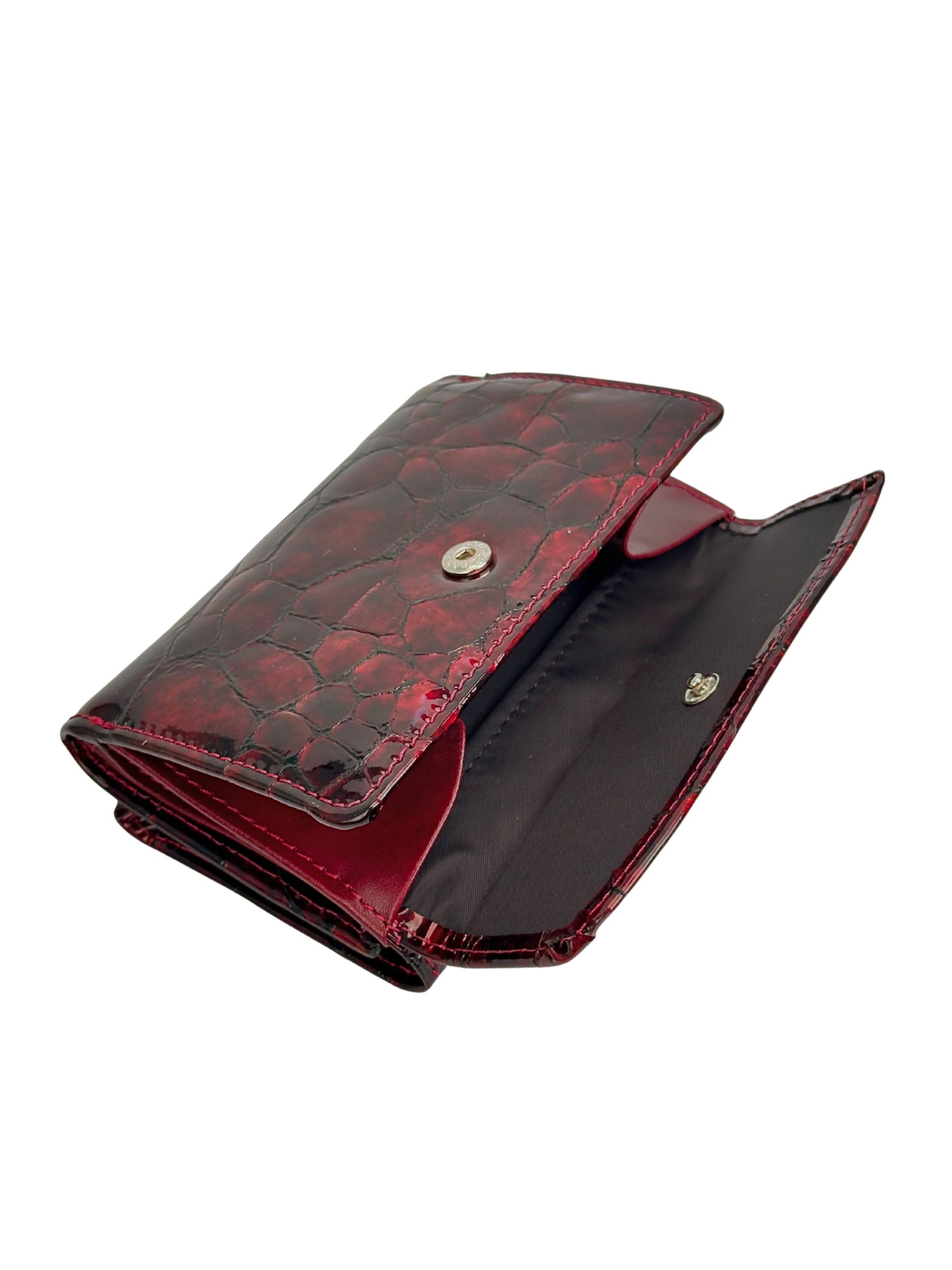 Portfel zachwyca głębokim, rubinowym kolorem oraz elegancką, błyszczącą strukturą inspirowaną skórą krokodyla. Wyrazista faktura i subtelny połysk nadają mu ekskluzywnego stylu, który doskonale podkreśla charakter właścicielki.