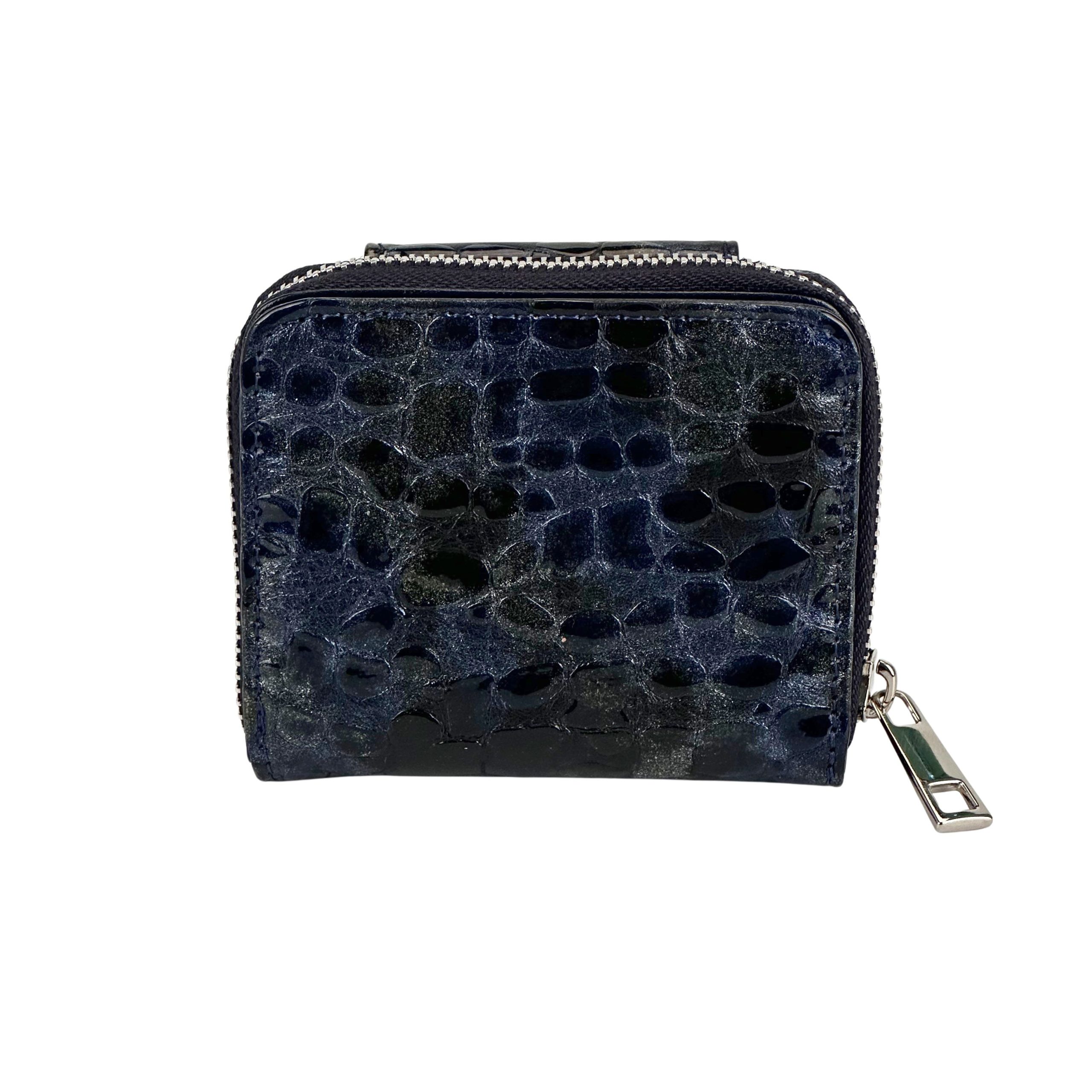 Wykonany z wysokiej jakości skóry naturalnej o efektownej, błyszczącej fakturze inspirowanej skórą krokodyla, zachwyca głębokim kolorem granatu ze złoto-zielonym dodatkiem. To kolor jakiego nie znajdziesz nigdzie. Subtelny połysk pięknie odbija światło, podkreślając luksusowy charakter dodatku i sprawiając, że portfel przyciąga spojrzenia.