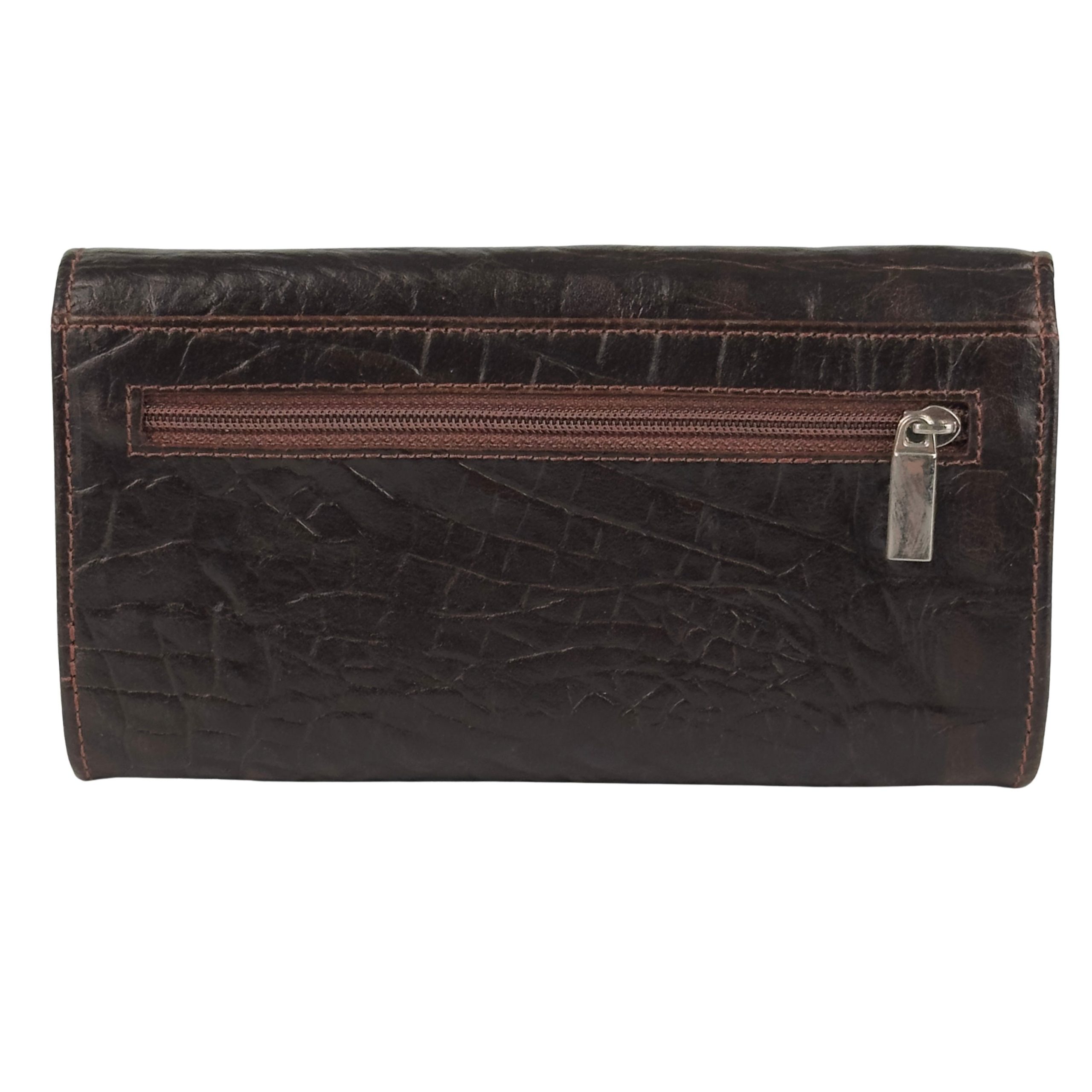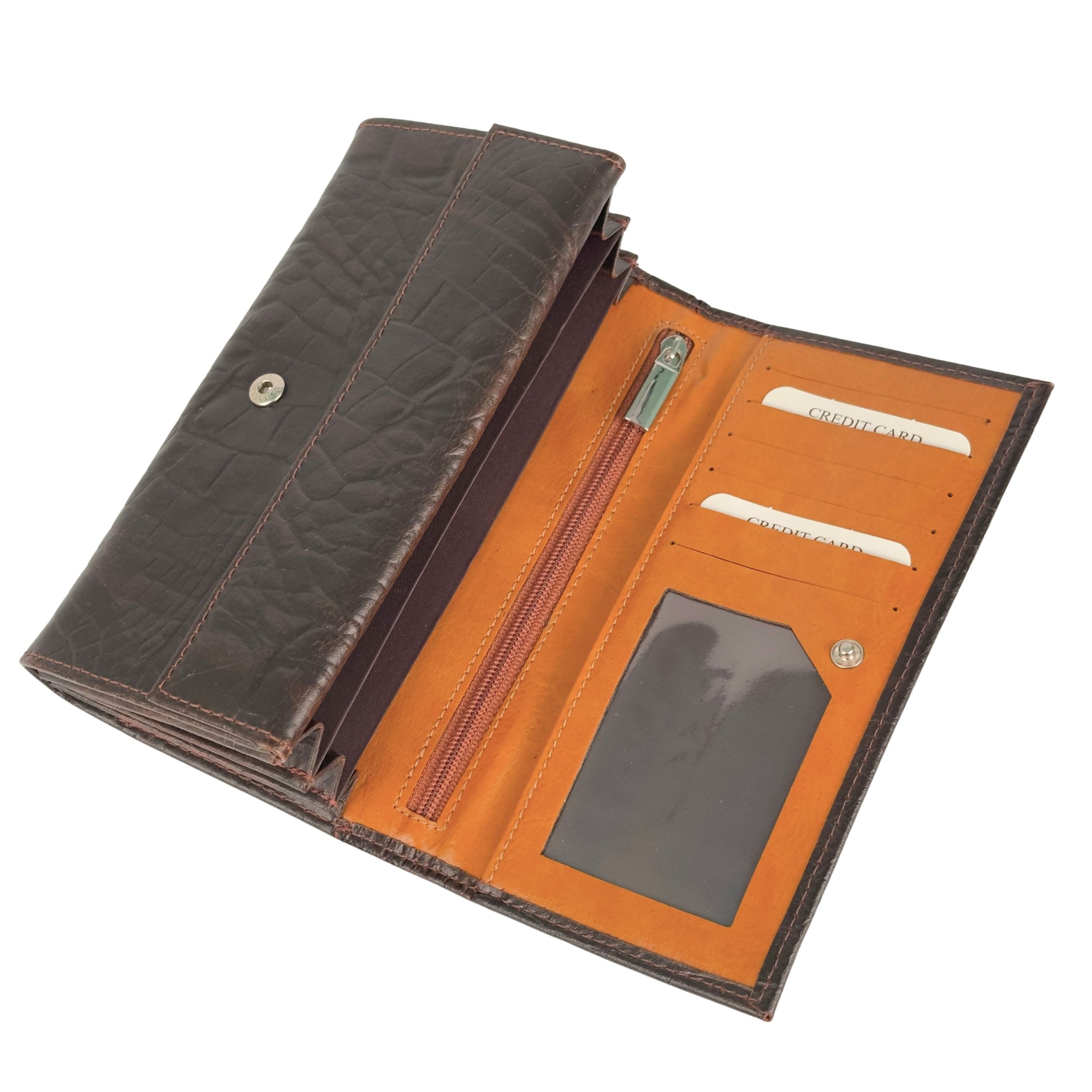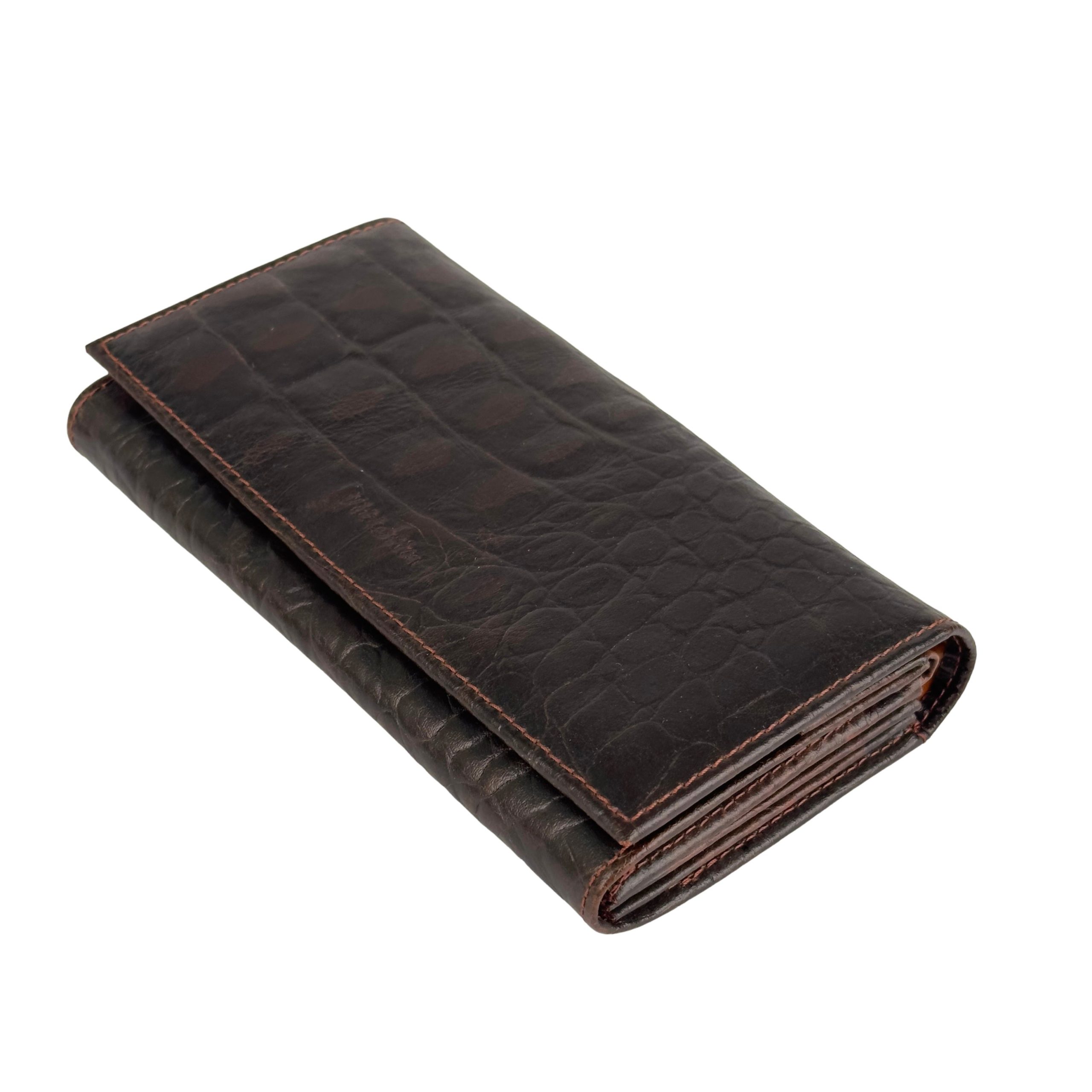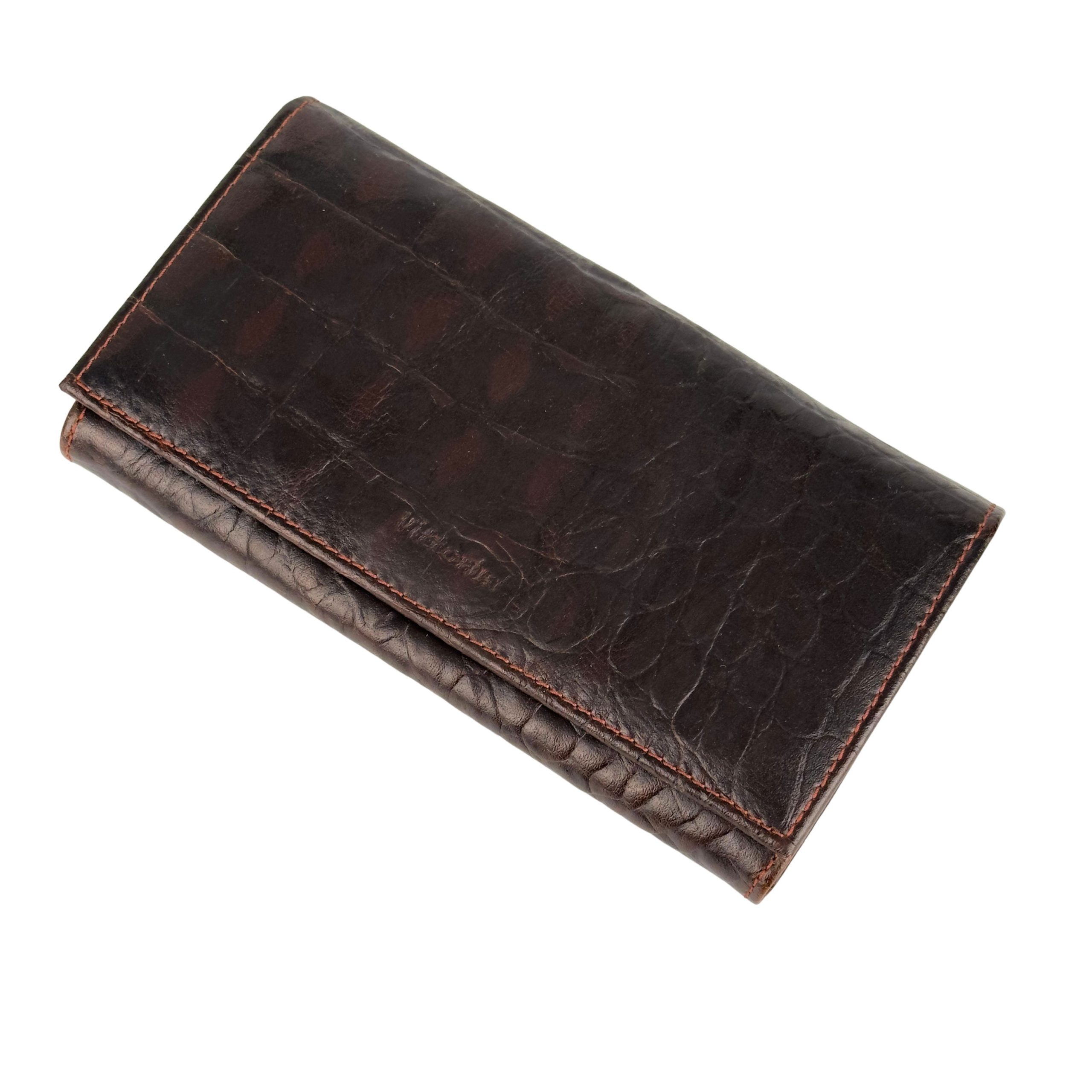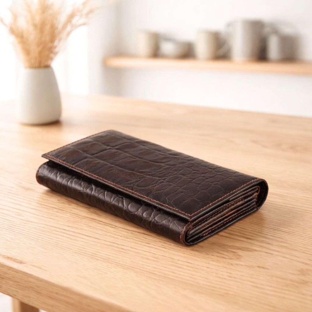 Struktura skóry „croco” to synonim prestiżu, który nigdy nie wychodzi z mody. Brązowa barwa nadaje mu szlachetności, a jasny środek nie tylko świetnie wygląda, ale również ułatwia szybkie odnalezienie potrzebnych dokumentów. Mimo smukłego profilu (tylko 2,5 cm grubości), portfel oferuje imponującą przestrzeń do przechowywania.