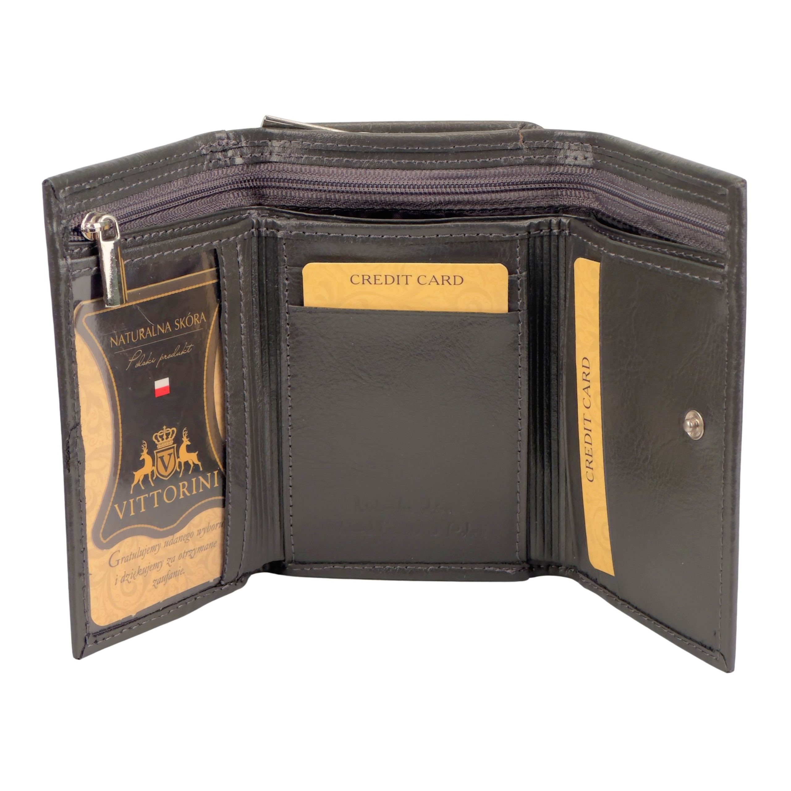Organizacja kart: Wewnątrz znajdziesz 4 przegródki na karty oraz dodatkową zafoliowaną kieszonkę – idealną na zdjęcie bliskiej osoby lub dokument tożsamości.