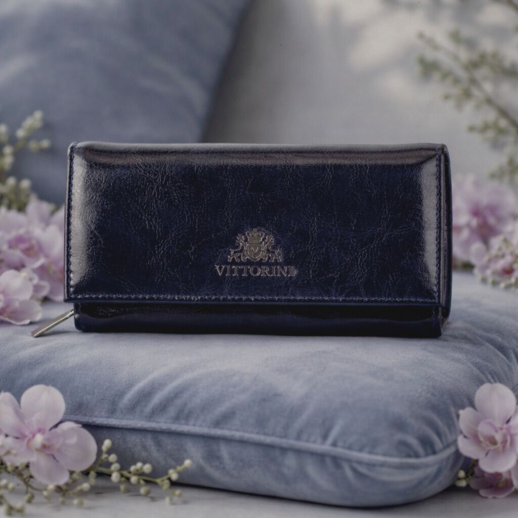 Portfel w kolorze granatowym z cudownym czerwonym wnętrzem.