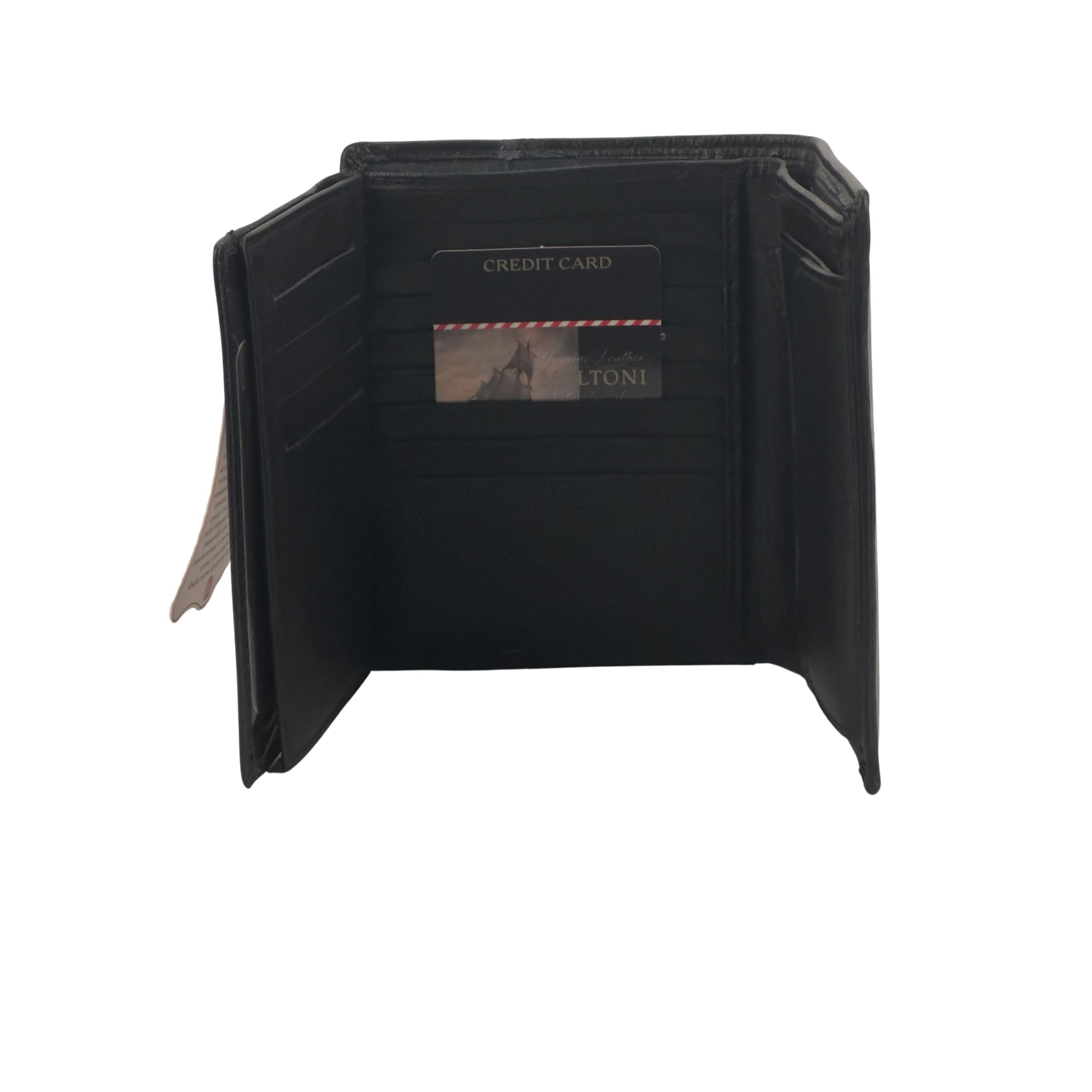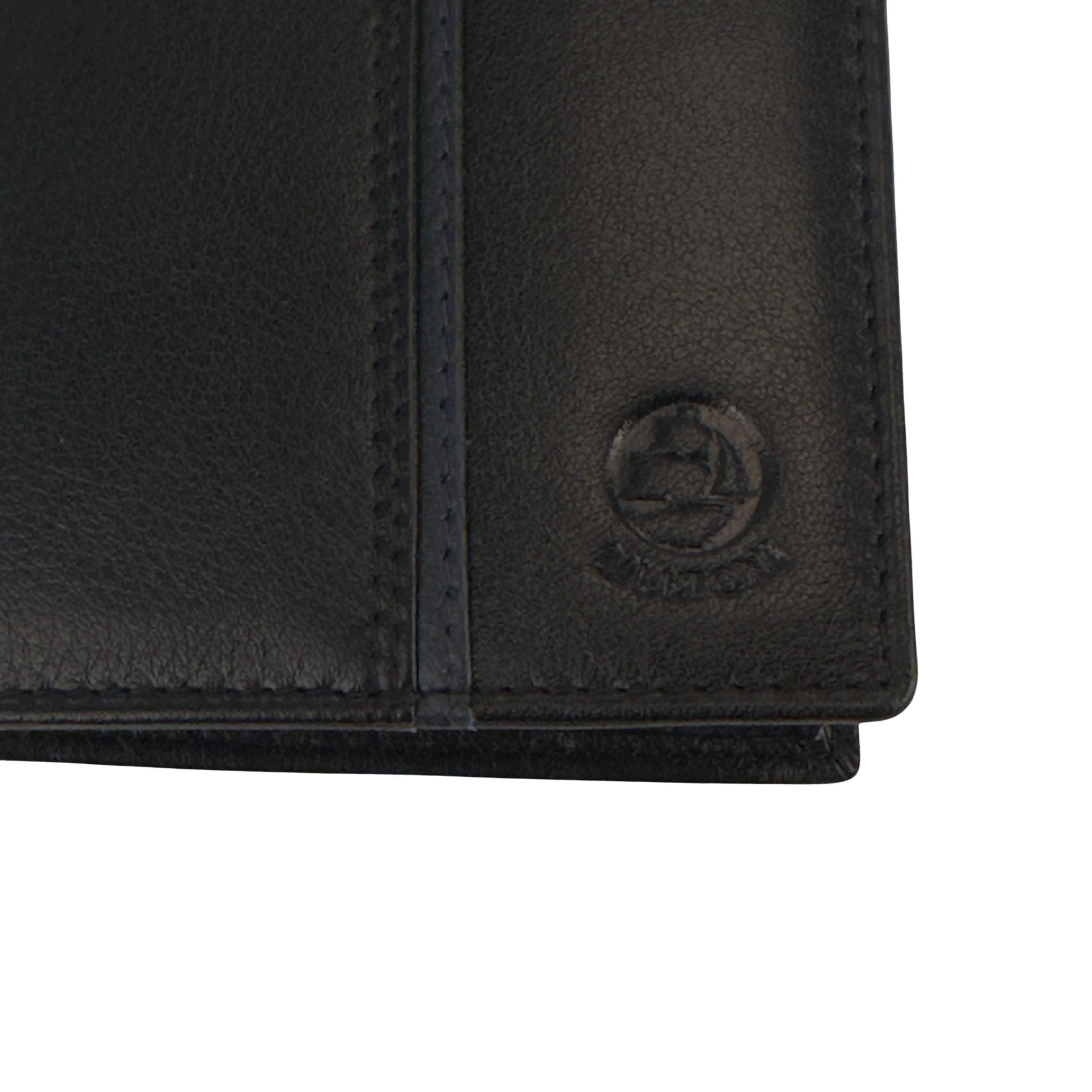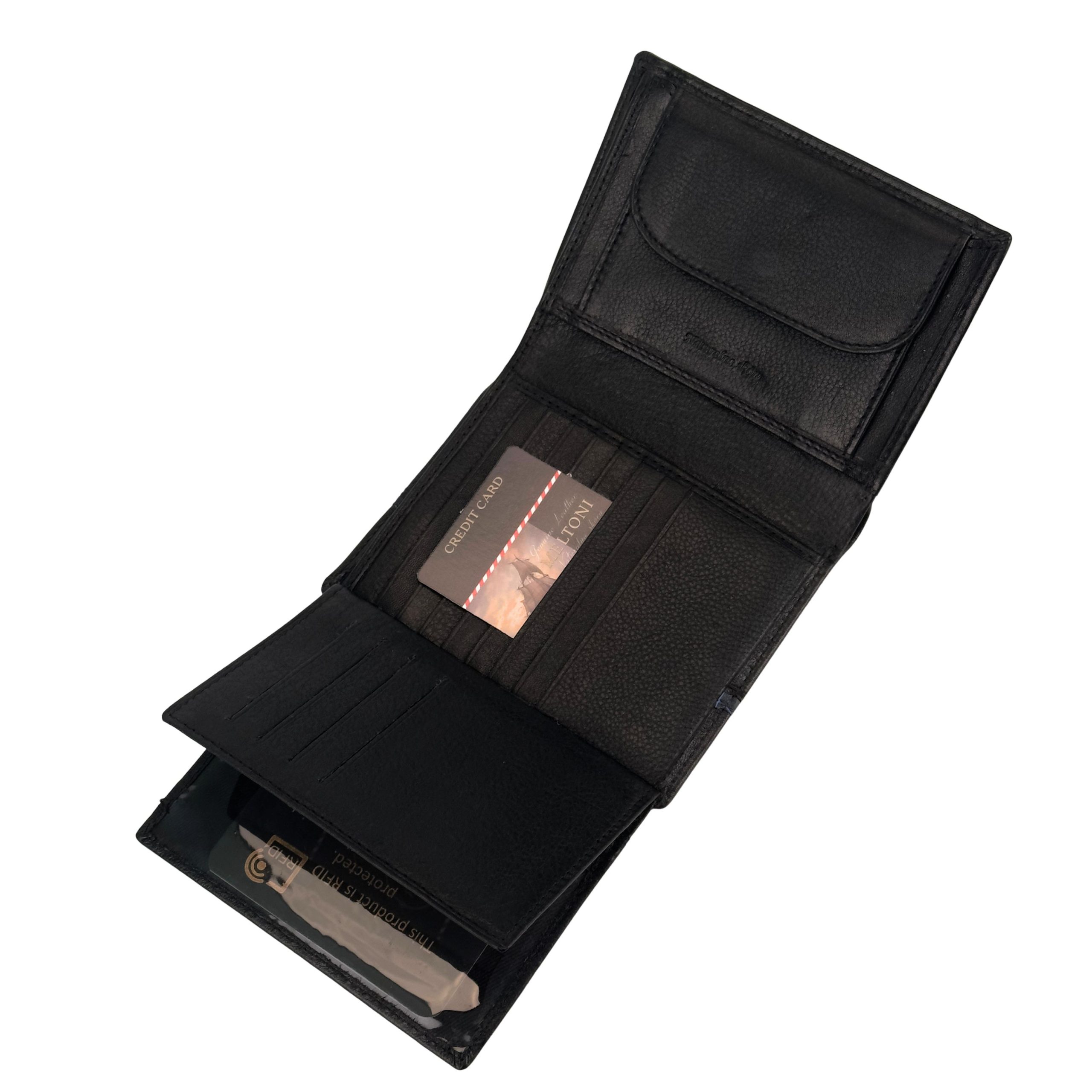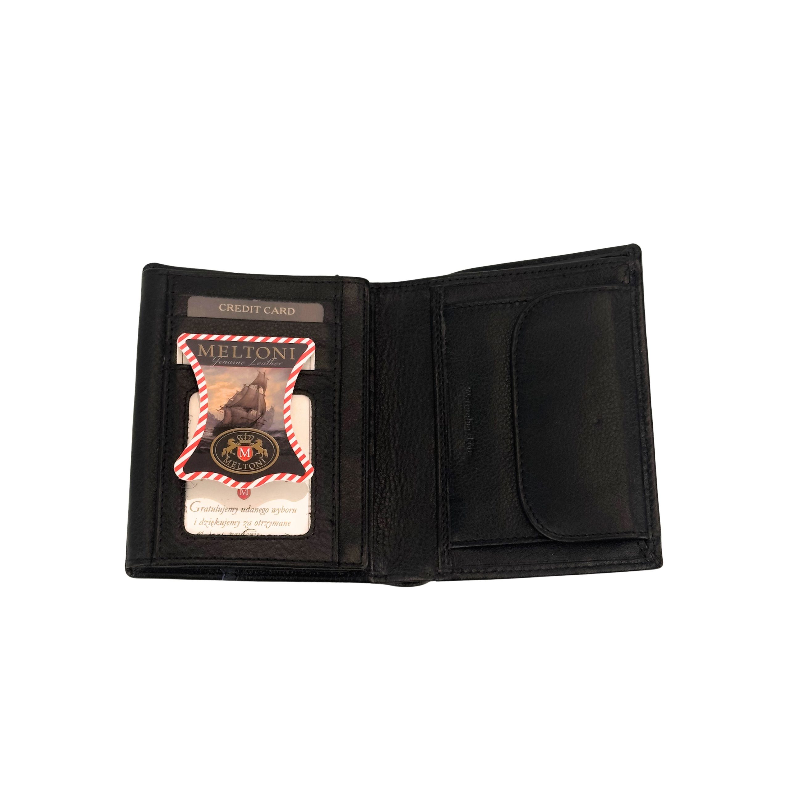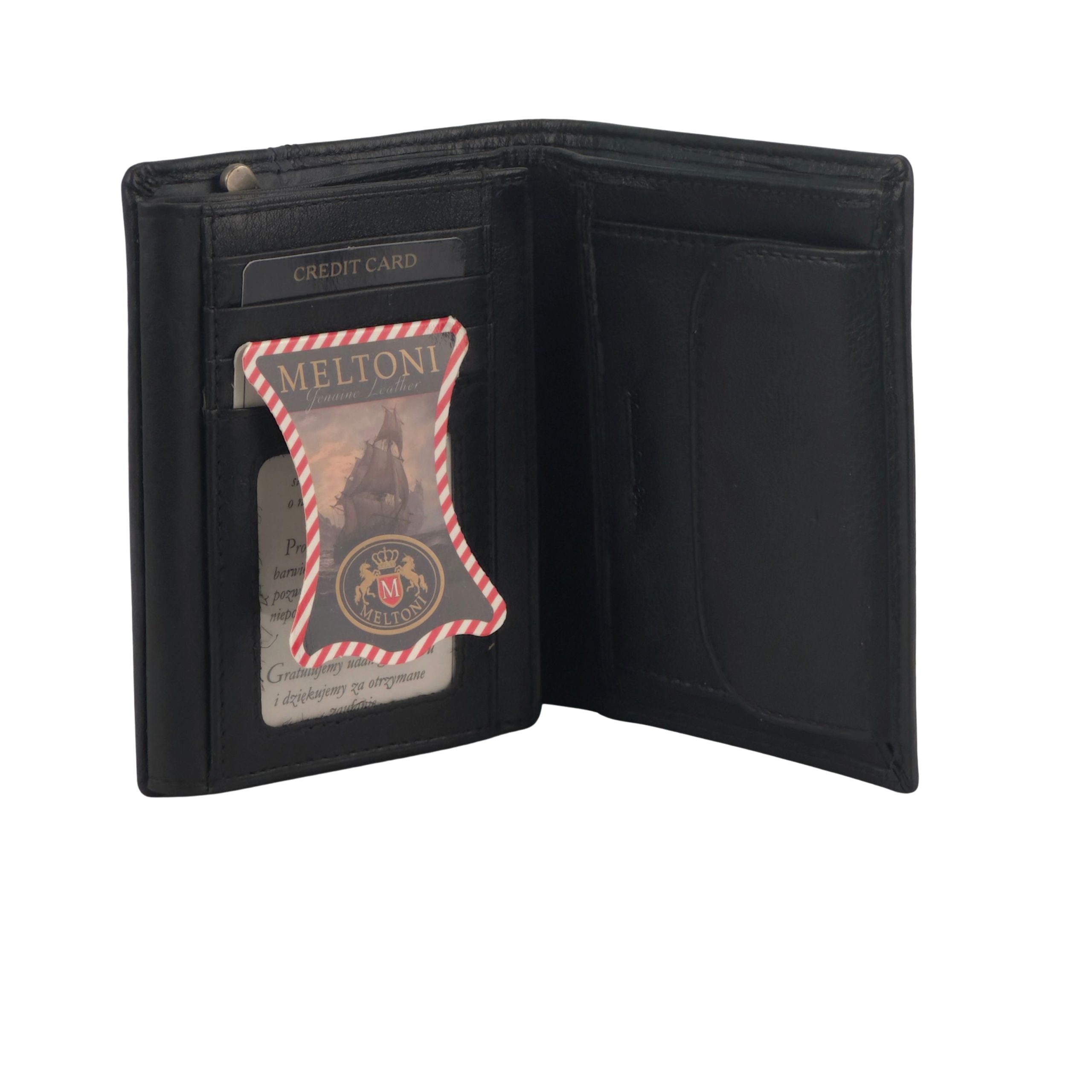 Jeśli szukasz portfela, który pomieści absolutnie wszystko, a przy tym zachwyca nowoczesnym sznytem, ten model marki Meltoni jest stworzony dla Ciebie. Wykonany z wysokiej klasy czarnej skóry naturalnej, został ozdobiony pionowym, granatowym paskiem, który nadaje mu dynamicznego i prestiżowego wyglądu.