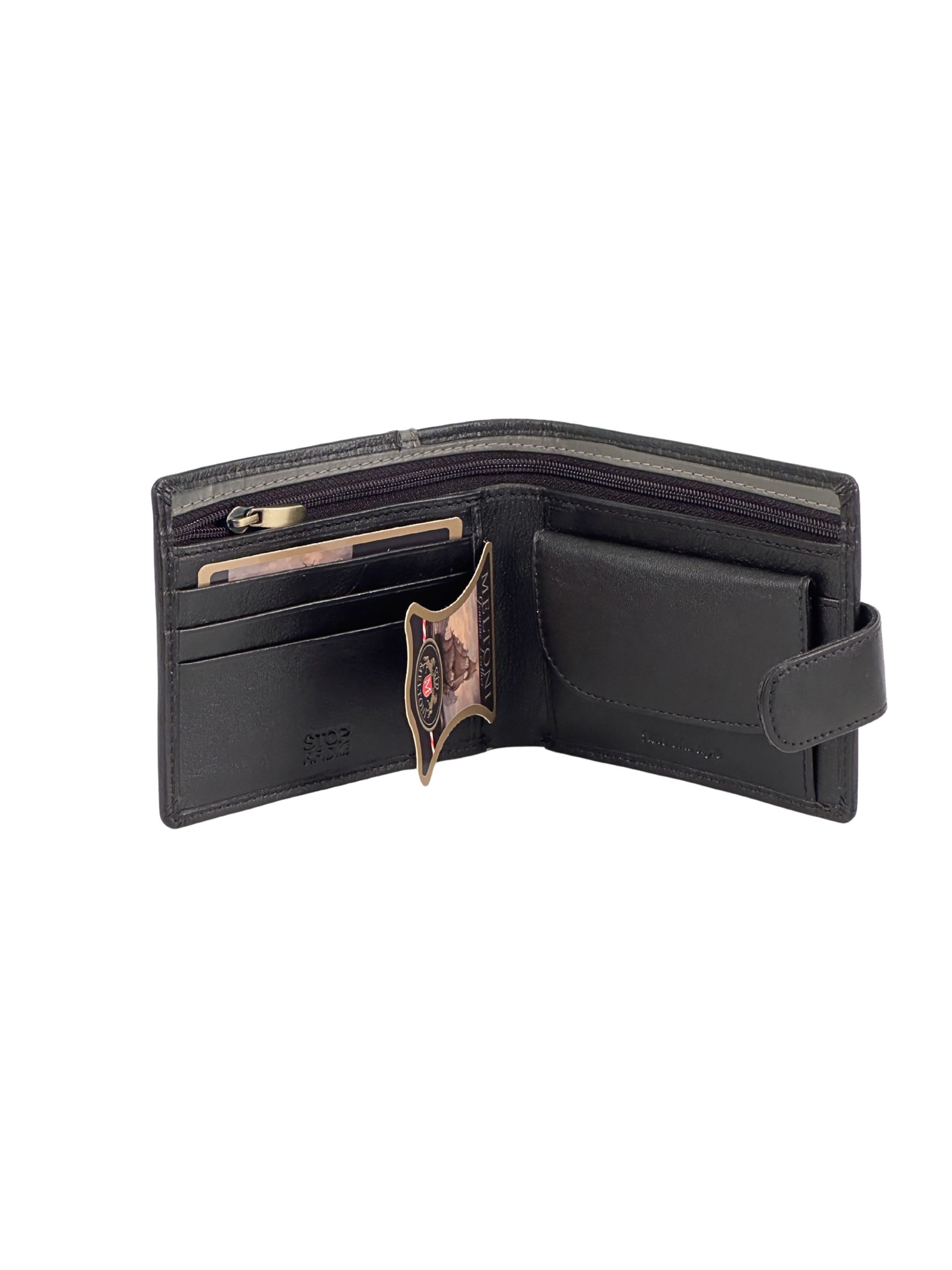 Portfel został wyposażony w solidne zapięcie na napę (zatrzask), które zapobiega przypadkowemu otwarciu się w kieszeni czy torbie. Stylistyka vintage w połączeniu z precyzyjnymi przeszyciami sprawia, że jest to idealny dodatek zarówno do garnituru, jak i codziennych jeansów.
