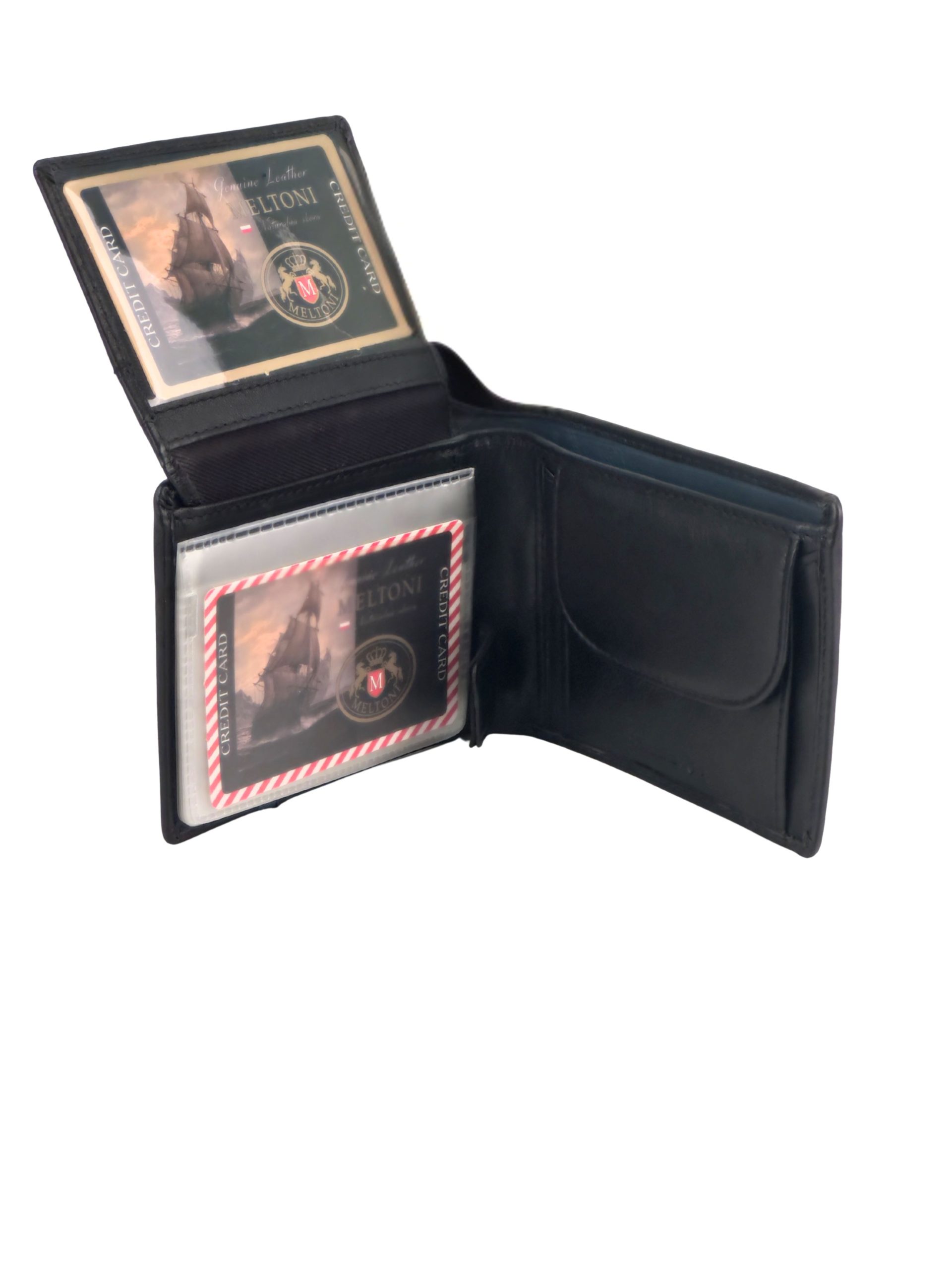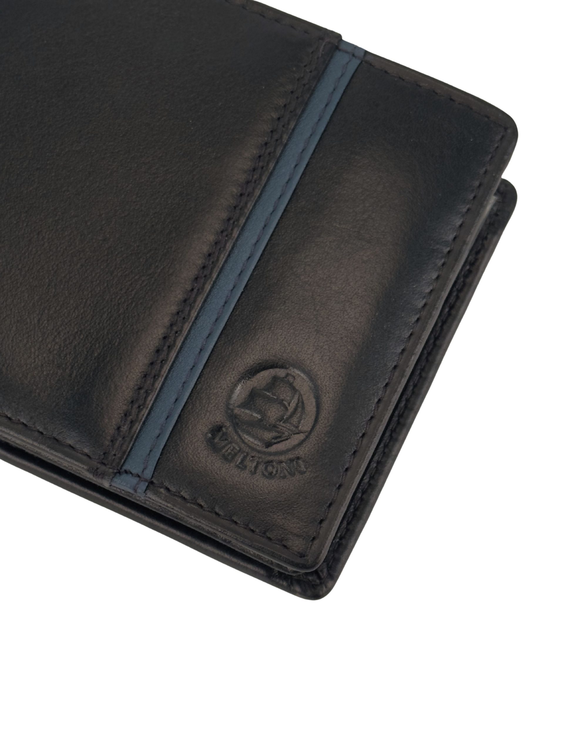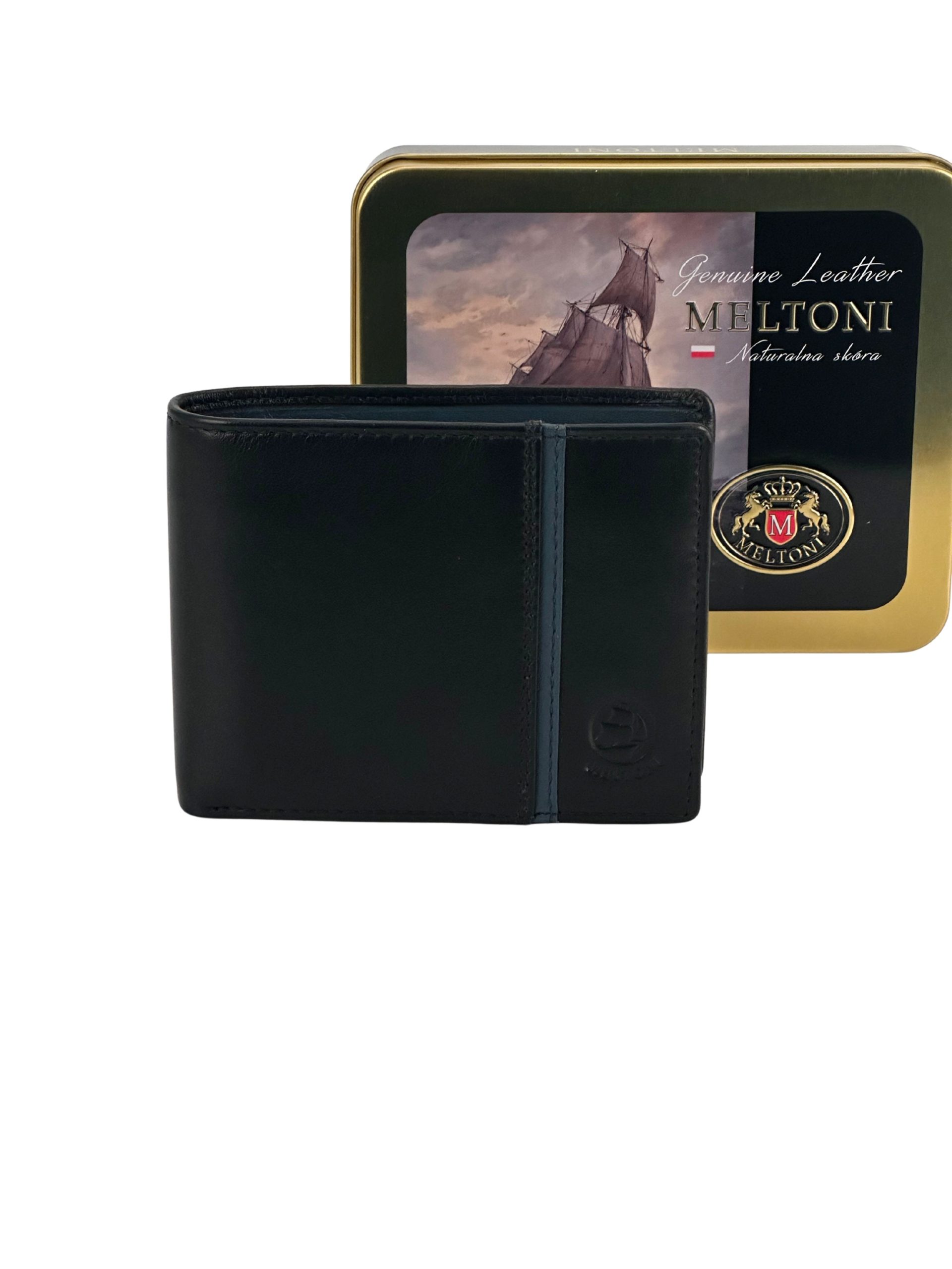 Klasyka spotyka nowoczesny detal. Ten wyjątkowy portfel marki Meltoni został wykonany z najwyższej jakości czarnej skóry naturalnej, którą przełamuje stylowy, granatowy pasek ozdobny. To idealna propozycja dla mężczyzn, którzy szukają portfela o dużej pojemności, ale zachowującego smukły, elegancki wygląd.
