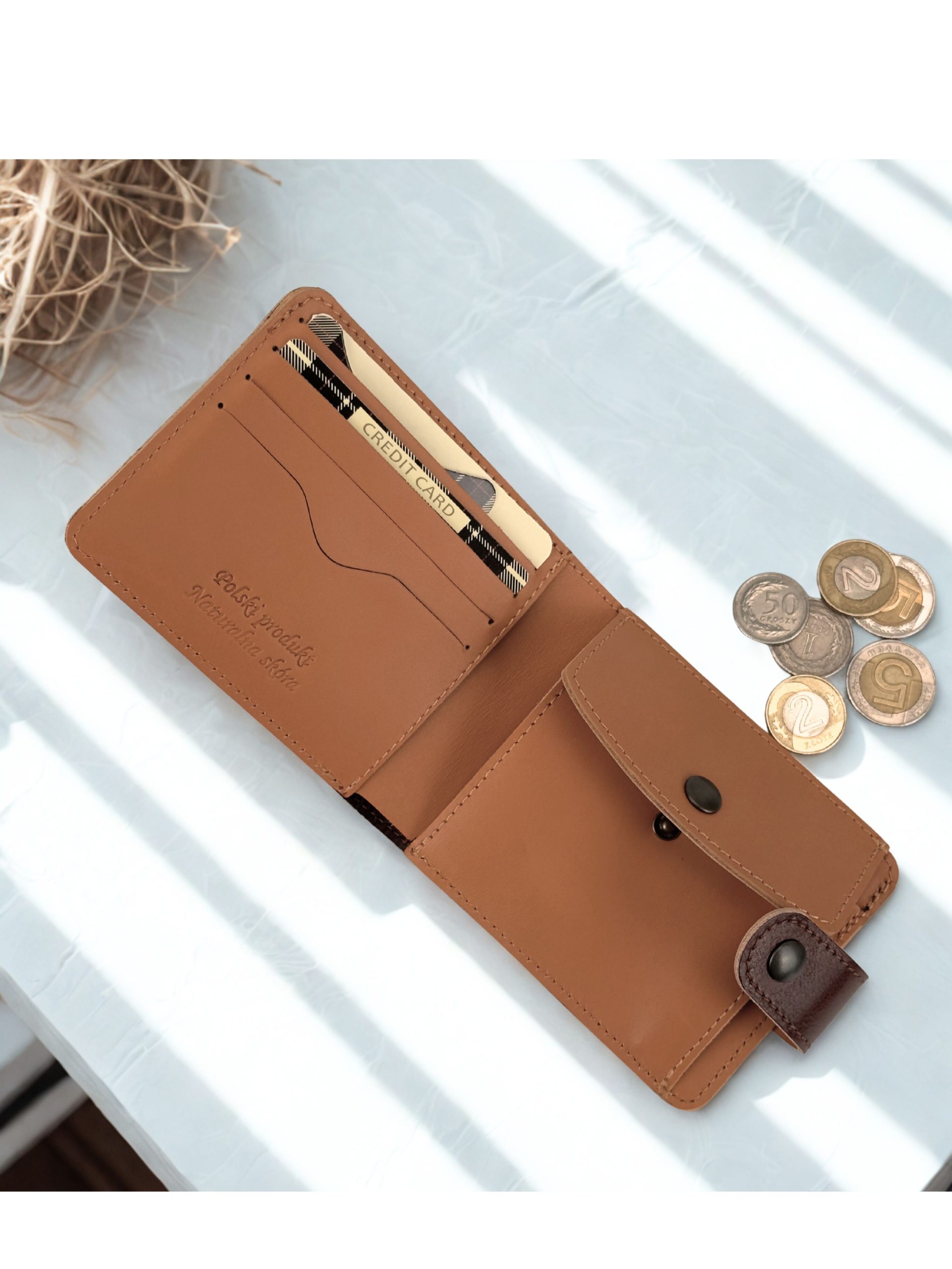 Kieszeń na bilon: Klasyczna kieszonka zapinana na napę zapewnia szybki i bezpieczny dostęp do monet.