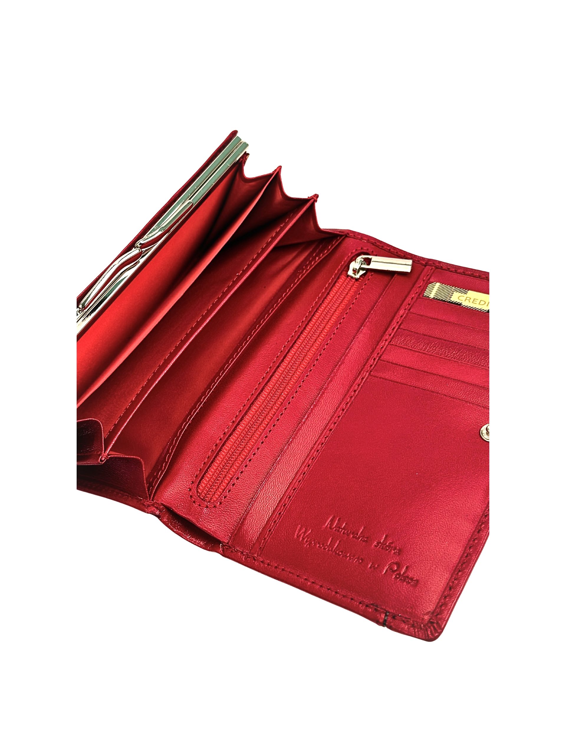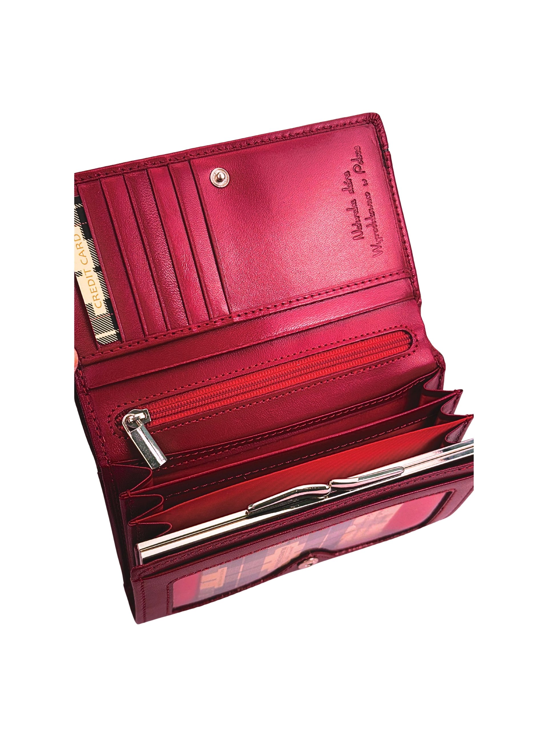 Klasyczny czerwony kolor przyciąga uwagę i sprawia, że portfel nabiera modnego wyglądu.