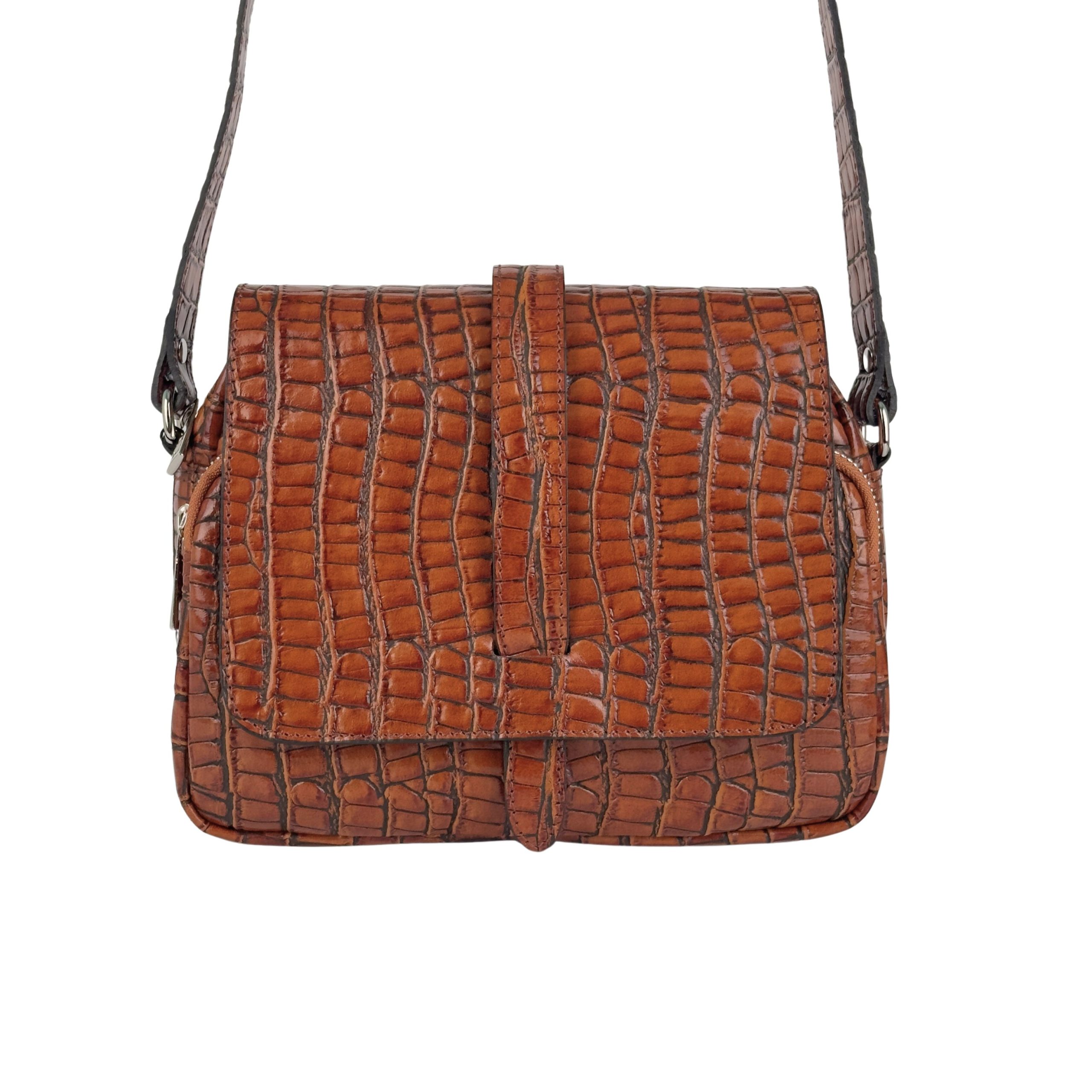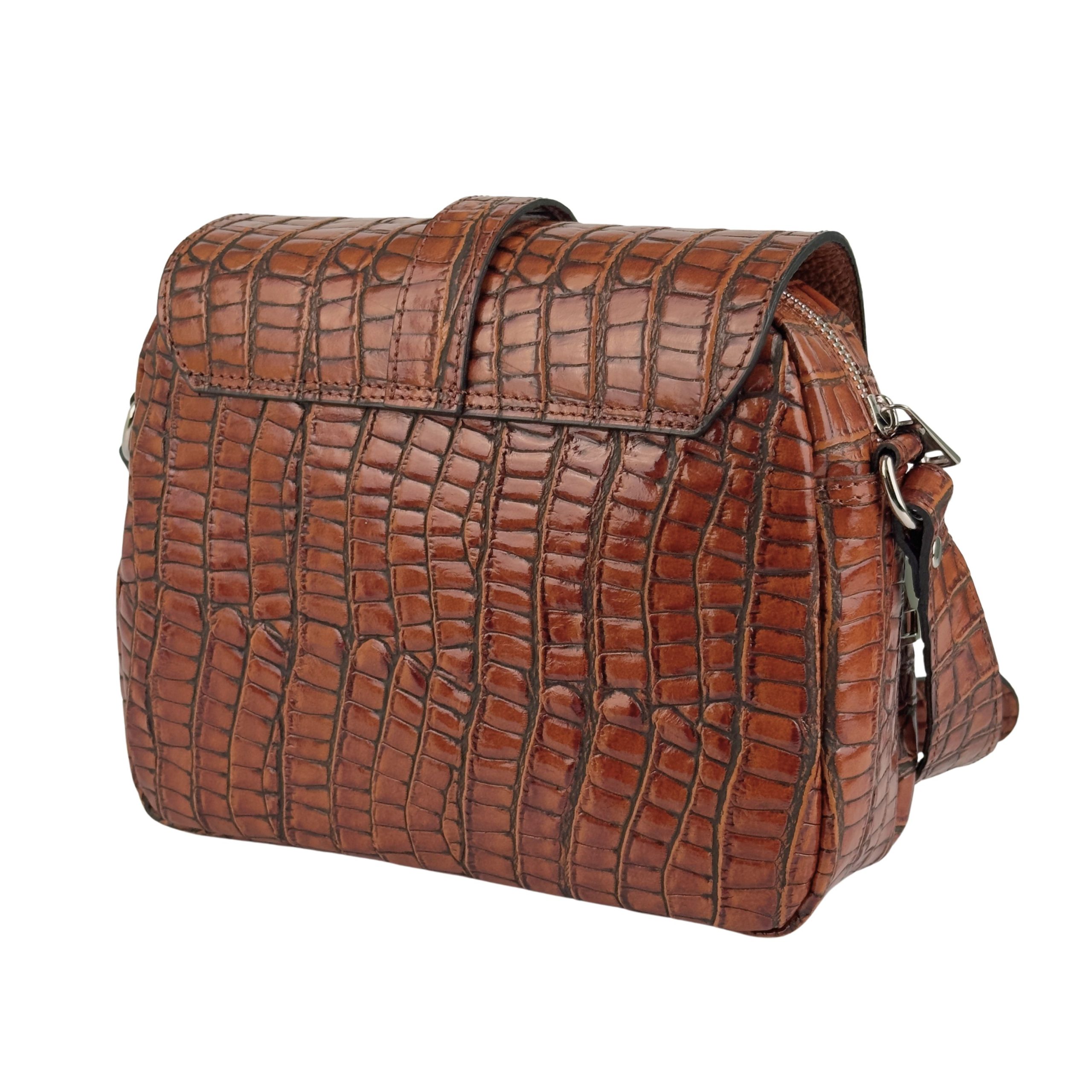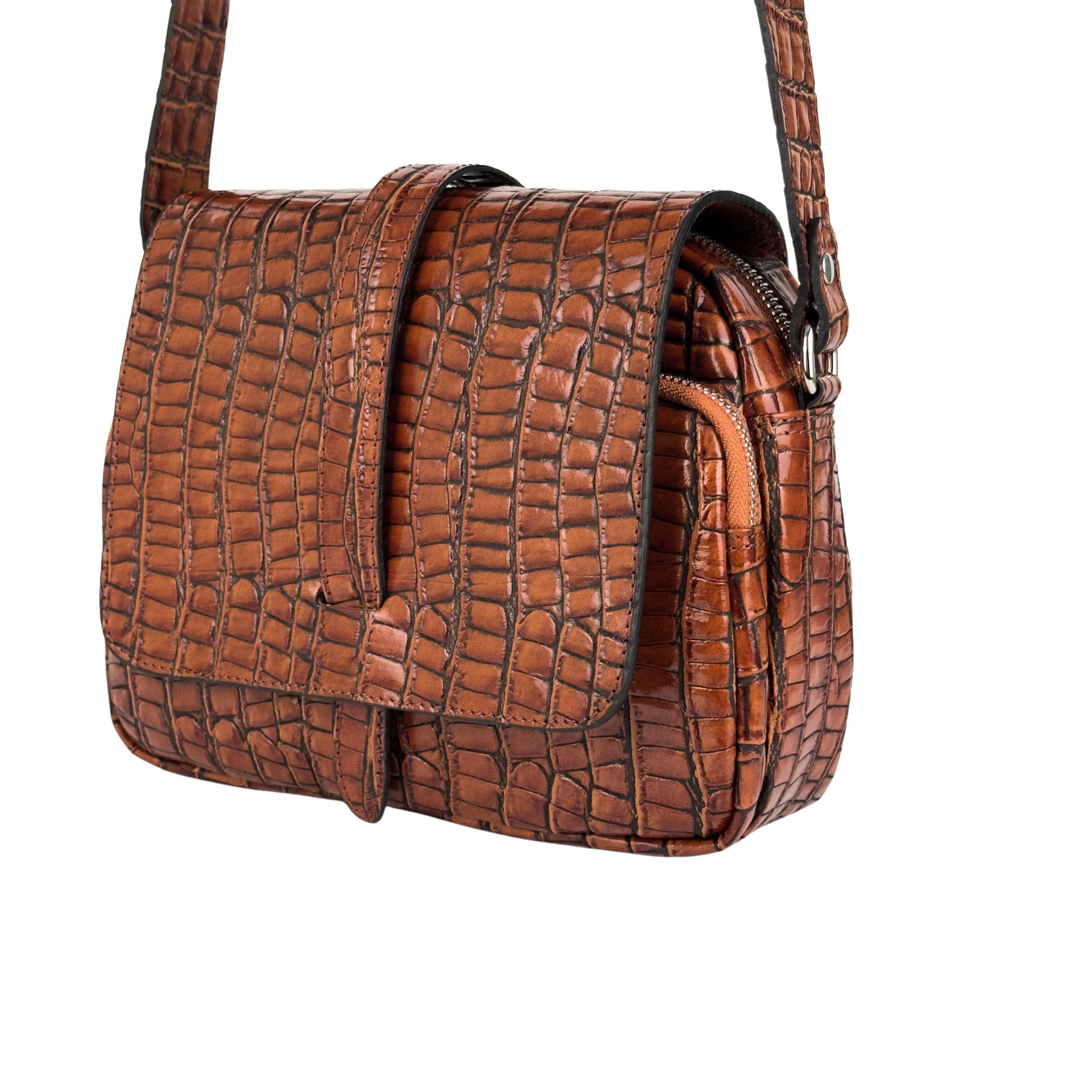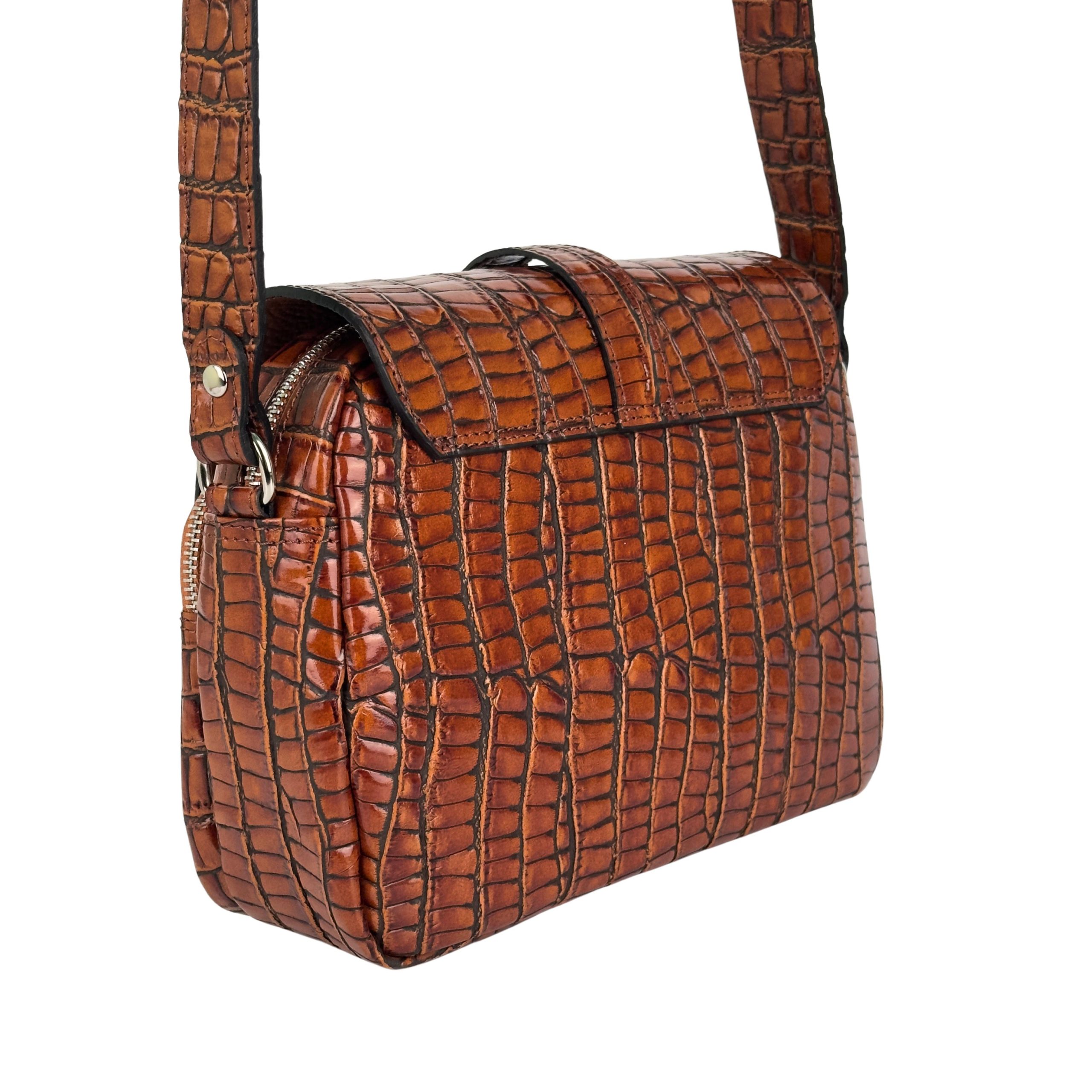 Elegancja spotyka funkcjonalność. Ta stylowa listonoszka wykonana z wysokiej jakości skóry naturalnej to propozycja dla kobiet, które szukają dodatku z charakterem. Wyraziste tłoczenie na wzór skóry krokodyla w ciepłym, koniakowym odcieniu sprawia, że torba staje się centralnym punktem każdej stylizacji.