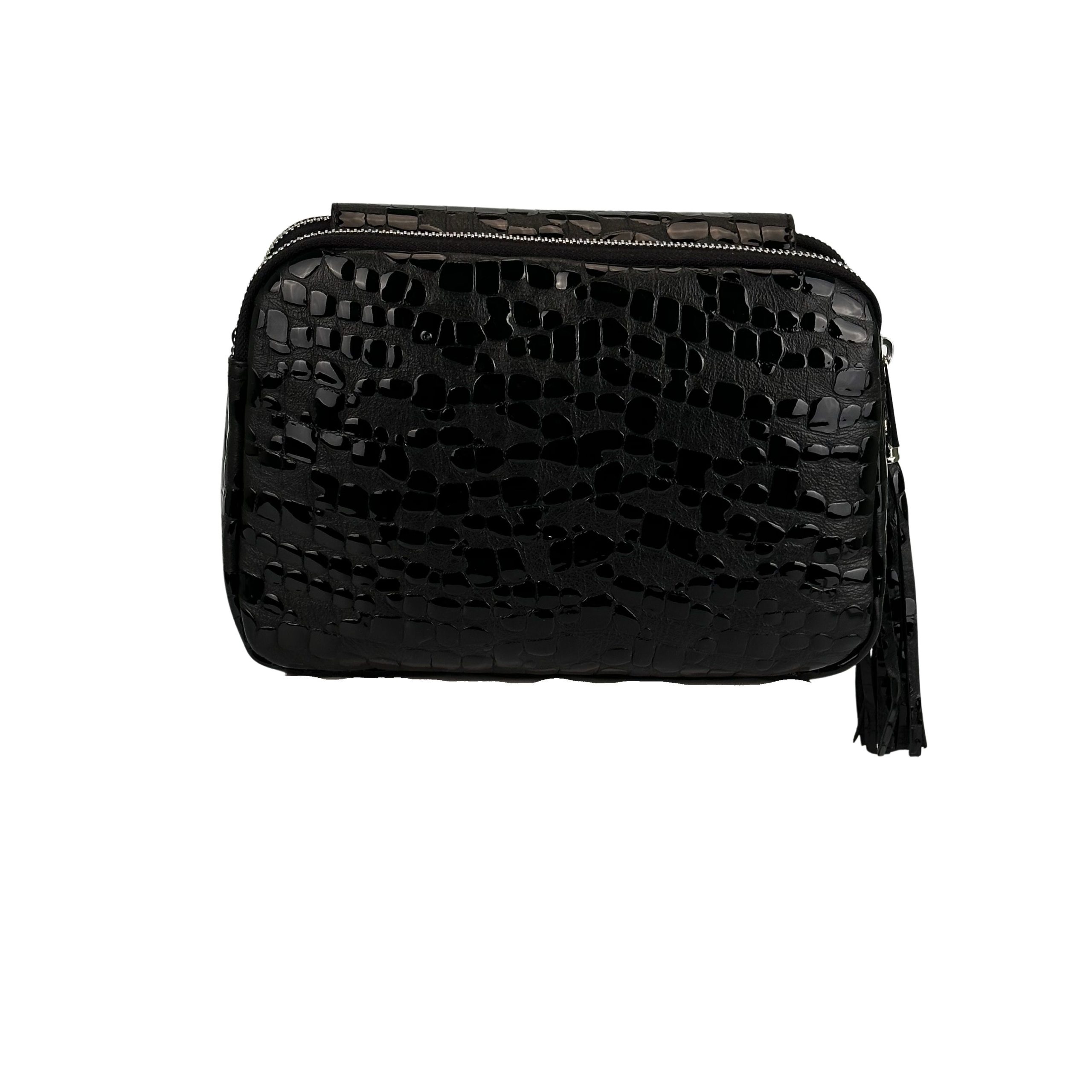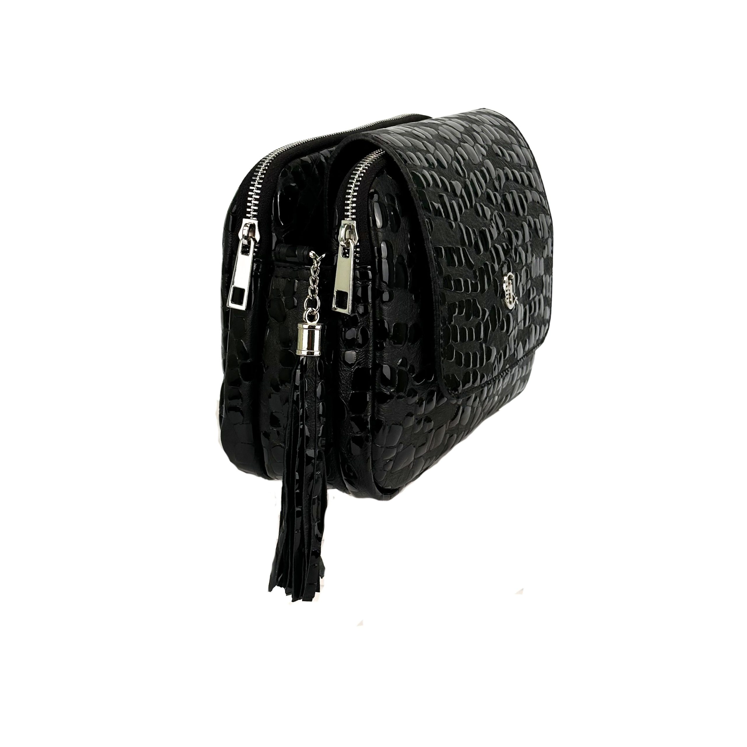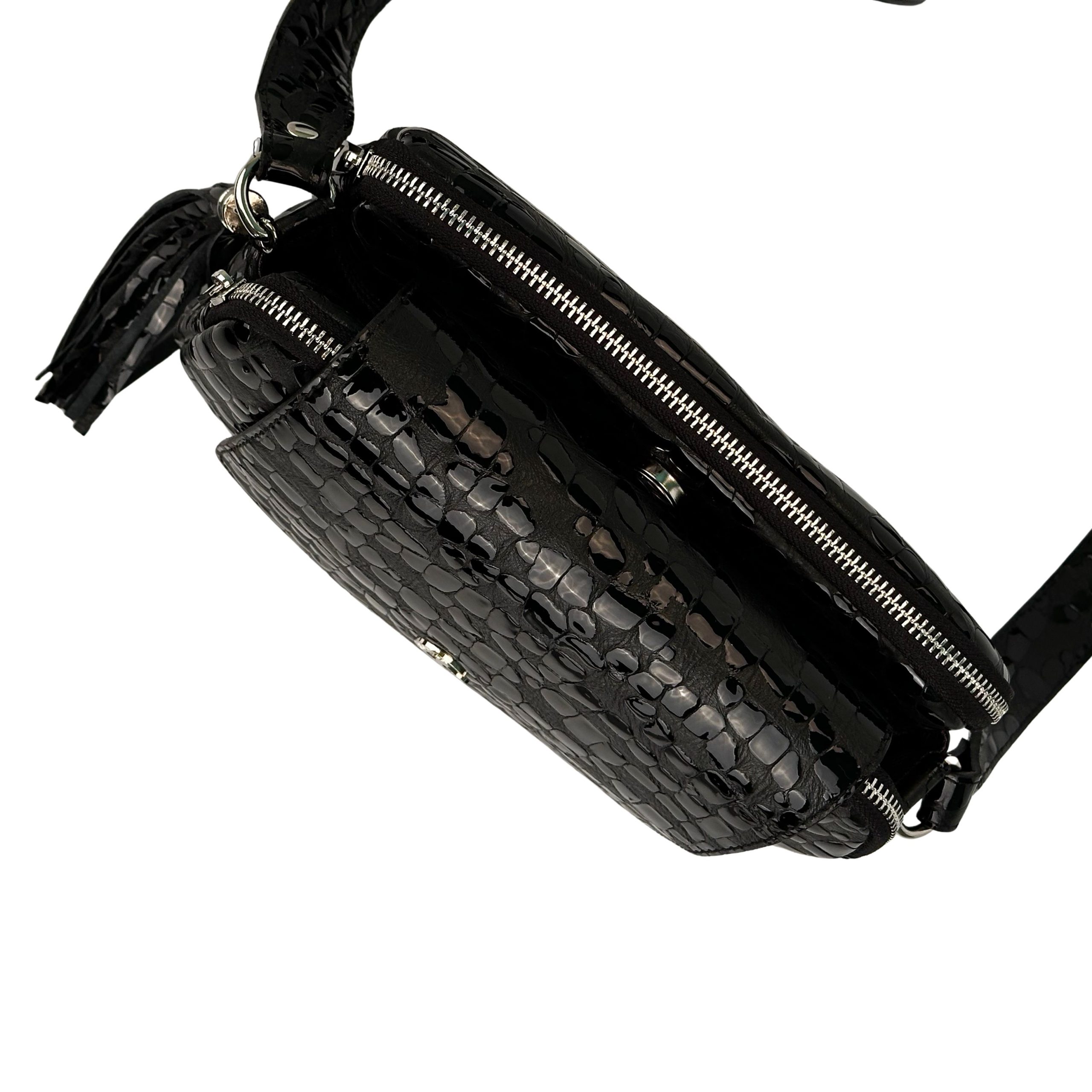 Elegancka torebka wykonana z naturalnej skóry, o efektownym tłoczeniu typu krokodyl w połyskującym, czarnym kolorze ze strukturą imitującą krople deszczu. Model zachwyca ponadczasowym stylem oraz starannym wykończeniem, podkreślając luksusowy charakter dodatku.